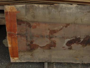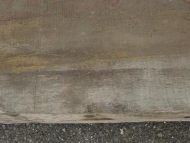現状色がくすんでしまっていますが、もともとの素材は明るい色味です。裏面の写真の一部、色の明るい部分が参考になるかと思います。幅の木表寸法は、末口800mm、中間750mm、元口820mmです。