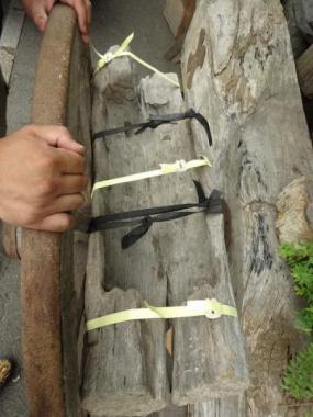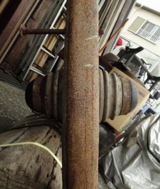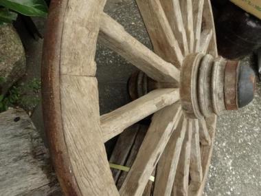 樫の木材で作られているようです。材木と材木をどのように組み合わせているかに、 注目してみてみるとなかなか味わい深いです。 お店でディスプレイされていた品物です。 自立させるための台座もお付けしております。 直径1,050mm車輪の厚み43mm中央部の厚み430mmです。 詳細お問わせください。