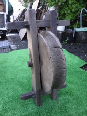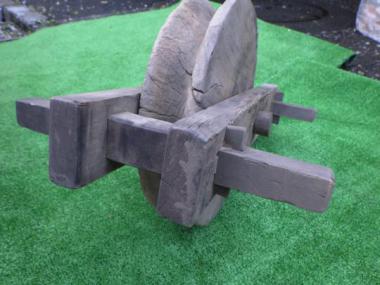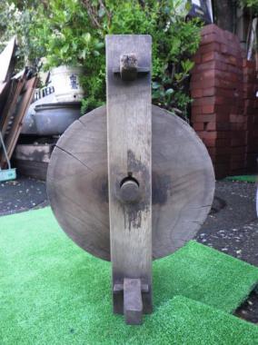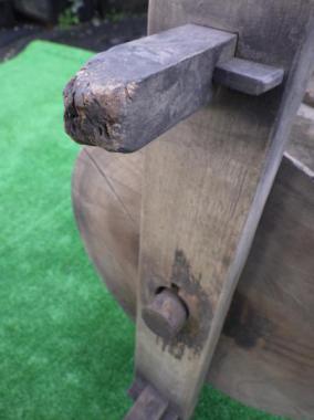 井戸の上のところにある滑車です。長く時間を経たことにより乾燥し、独特の亀裂が車の部分に見られ、味わい深いです。