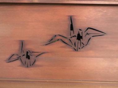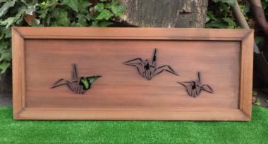 わけあり品。透し彫りに割れている箇所があるため。反りがあるため。折り鶴が控えめにちょこんと配置されていて可愛らしいです。