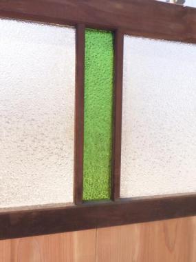 板部分のみ新材を使うことで清々しい印象になっています。もともとの枠素材との色のコントラストもよく調和しています。珍しい緑色のダイヤガラスが使われています。
