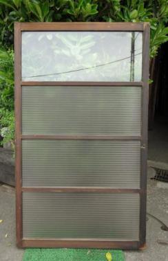 葛飾区の民家で使われていたものです。背が低いガラス戸です。窓としても使えるかと思います。梨地で横縞のモールガラス下三段に入っています。一番上は透明です。