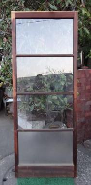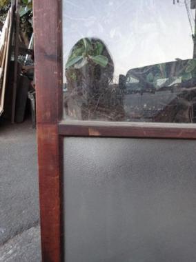 梨地が一番下に入っています。他は透明ガラスです。シンプルなデザインですので、使いやすい建具かと思います。色がはげてしまっている箇所は柿渋塗装で色味を馴染ませることも可能です。