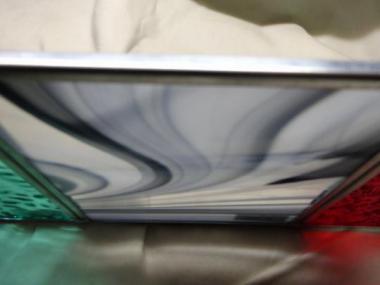 洋物の色ガラスです。ご希望の大きさにカットして販売いたします。白からグレーのグラデーションが印象的なガラス。マーブル状に湾曲した模様にあわせて、貝殻のようなおうとつが微かにできています。白、透明、グレーが重なったような絶妙なつくりに洋物の繊細な手業を感じます。