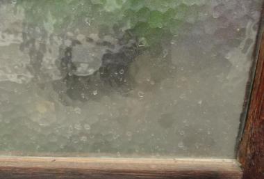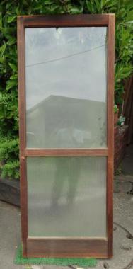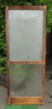 わけあり品。ガラスに汚れがみられるため。最近のデザインでは見られないガラスの組み合わせです。上段が曇りから透明のグラデーションです。下段は水玉の鱗のような模様ガラスです。在庫のうち1枚だけ下段ガラスが梨地です。葛飾区の民家で使われていたものです。