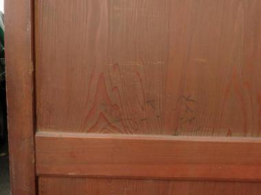筆で書いたような文字が薄く残っています。落ち着いた赤茶色で上品な印象です。