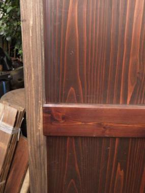 大きな戸を二分割して作り変えました。ぞれぞれ片側の縦桟が新しい材で、柿渋を塗装して調子を整えてあります。在庫のうち一枚は、笹の絵が付いています。