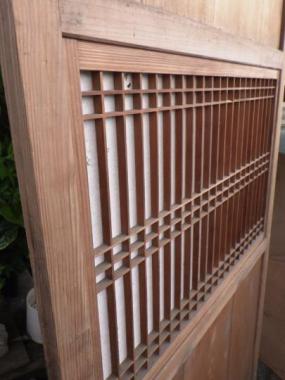 素材そのままという感じのする優しい色味です。在庫のうち2枚は取っ手付きです。腰に隙間、障子の格子に傷みが見られます。在庫のうち1枚は特に傷んでいる箇所が多いので5,000円お値引き致します。