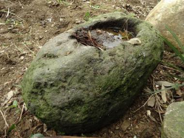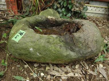 露地の中で万物のかげろいを感じられそうな仙人みたいな雰囲気のつくばいです。苔の付き具合、おうとつ、皺、どれにつけても通を喜ばせそうなひととなり。水を溜める所は300×180×70です。