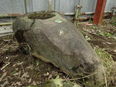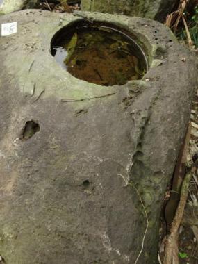 上から覗くとダイナミックな富士を思わせるかたち。穴や裂け目のような荒々しい表情もうかがわせる一筋縄では形容し難いすがた。庭園、露地に置かれれた時、その存在感にはっとさせられそうです。水が溜まる所は直径270×深さ100です。