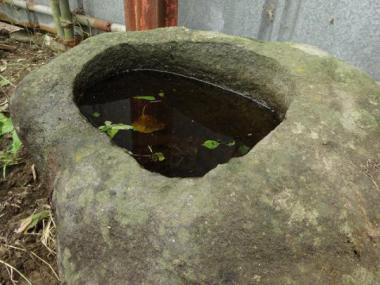 自然の石のかたちを生かしたつくばい。もともと置いてあった場所の陽のあたり加減によるものでしょうか、かたちに沿って所々、お化粧するように程よい苔の表情。すでに風情十分といえるでしょう。水が溜まる所は楕円のかたちになっており大きさは360×260×140です。