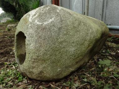 自然の石を見立てたつくばい。まとまることのない緩やかな曲線が繋がり、見つめているうちにふっと心が和んでくるような大らかなかたちをしています。水が溜まる所は、直径240×深さ110です。縁はとても素っ気なく水面のゆらめきをひきたてるような粋なつくり。
