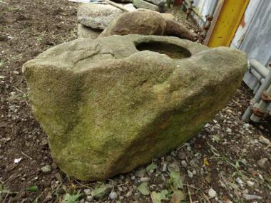 どの面から見ても面白い形が浮かび上がってきます。角は立っていないけれど、どことなく岩のような風情。いつまでたっても新鮮味を失わないような不思議な雰囲気をまとったつくばいです。水が溜まる所は、直径230×深さ100です。