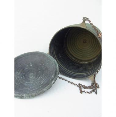 銅製の手洗い用の水入れです。大正時代頃のものと思われます。 何羽か鳥がついていて、ほほえましいデザインです。 サイズは高さ310mm(鎖の長さ含めず)幅直径180mmです。 詳細お問い合わせください。