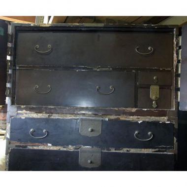 漆仕上げで、金具は唐金を使用。二段重ねになっています。価格は二段組み合わせた状態のお値段です。上が高さ520mm幅985mm奥行き450mmです。上段の単体価格は、50000円(税抜)下は、高さ520mm幅970mm奥行き450mmです。下段の単体価格は、30000円(税抜)詳細お問い合わせください。側面の拡大↓上段の扉を開いた状態の拡大↓