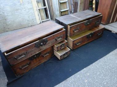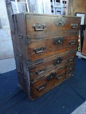 金具の文様のモチーフに藤が使われているようです。刀を入れる箪笥として使われていたもので、一家の貴重品を預けるのに相応しい立派なつくりです。材はシオジや桐がつかわれています。正面には特に素材の自然な艶が出ており、気品があります。上下段組の販売になります。下段の左下の引き出しは、鍵がかかっており開きません。上段の高さ:540mm 下段の高さ:535mm