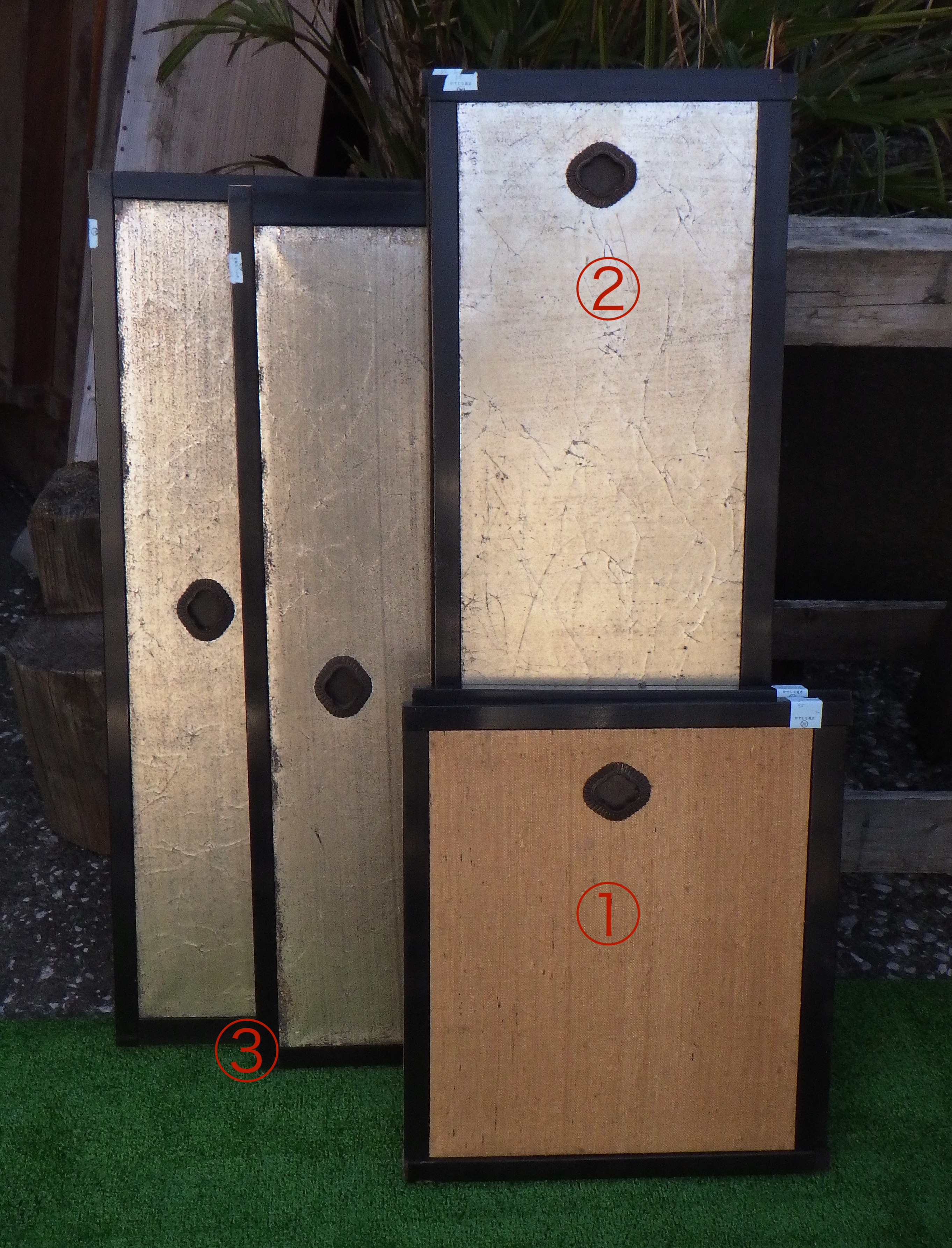 多摩の民家で使われていました。ふすまを解体することで引き手を取り出すことができます。引き手のサイズはおよそ55×50mmです。そのままふすまとして利用することもできます。 ふすまのサイズは以下の通りです。それぞれ2枚ずつ在庫がございます。 ①355×405×18 ②285×864×20 ③770×430×20