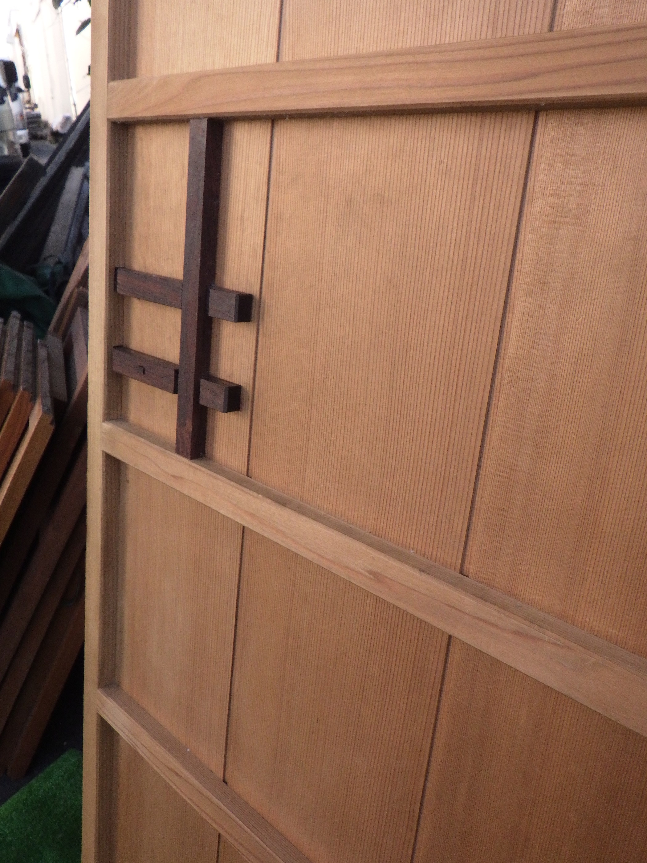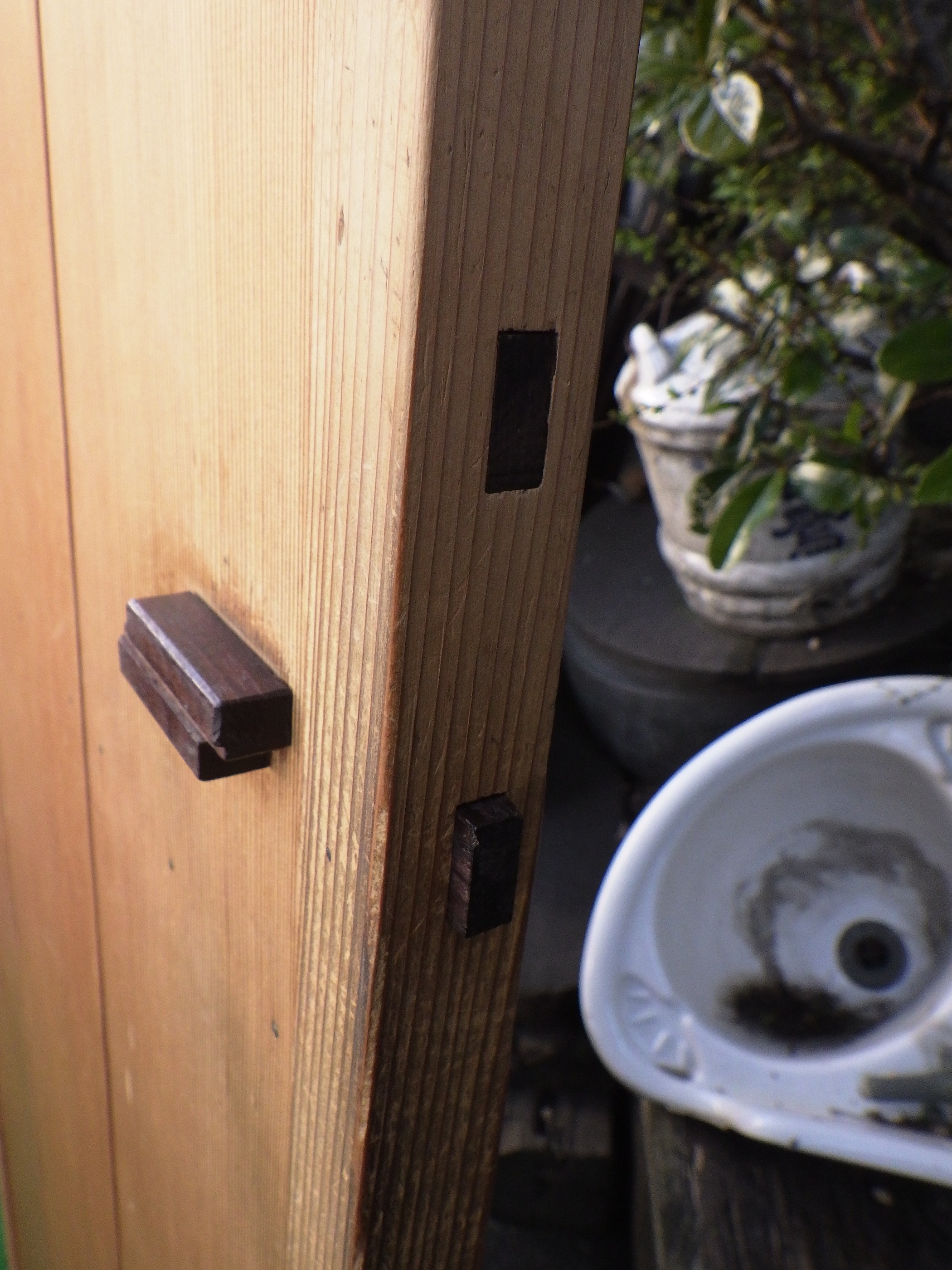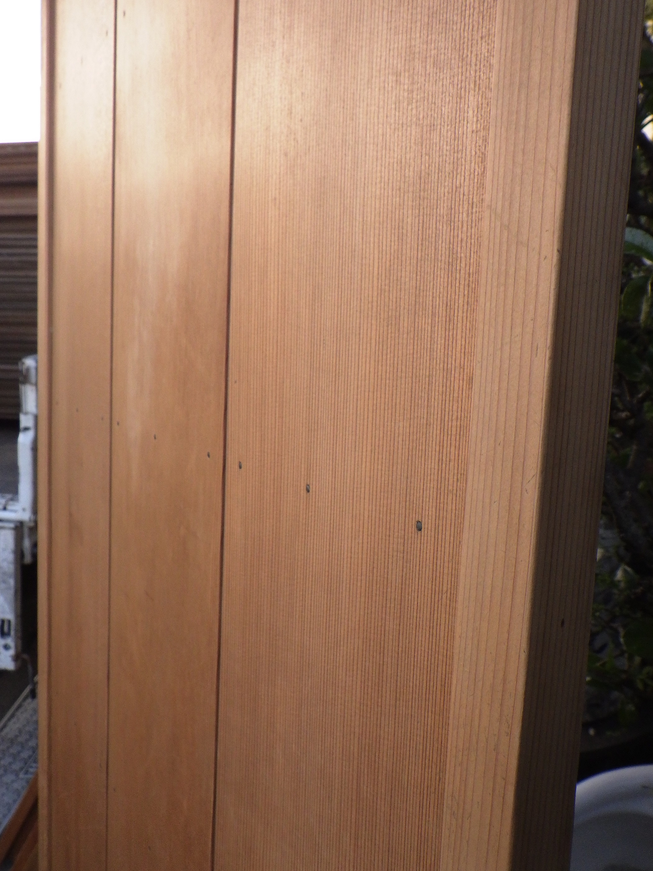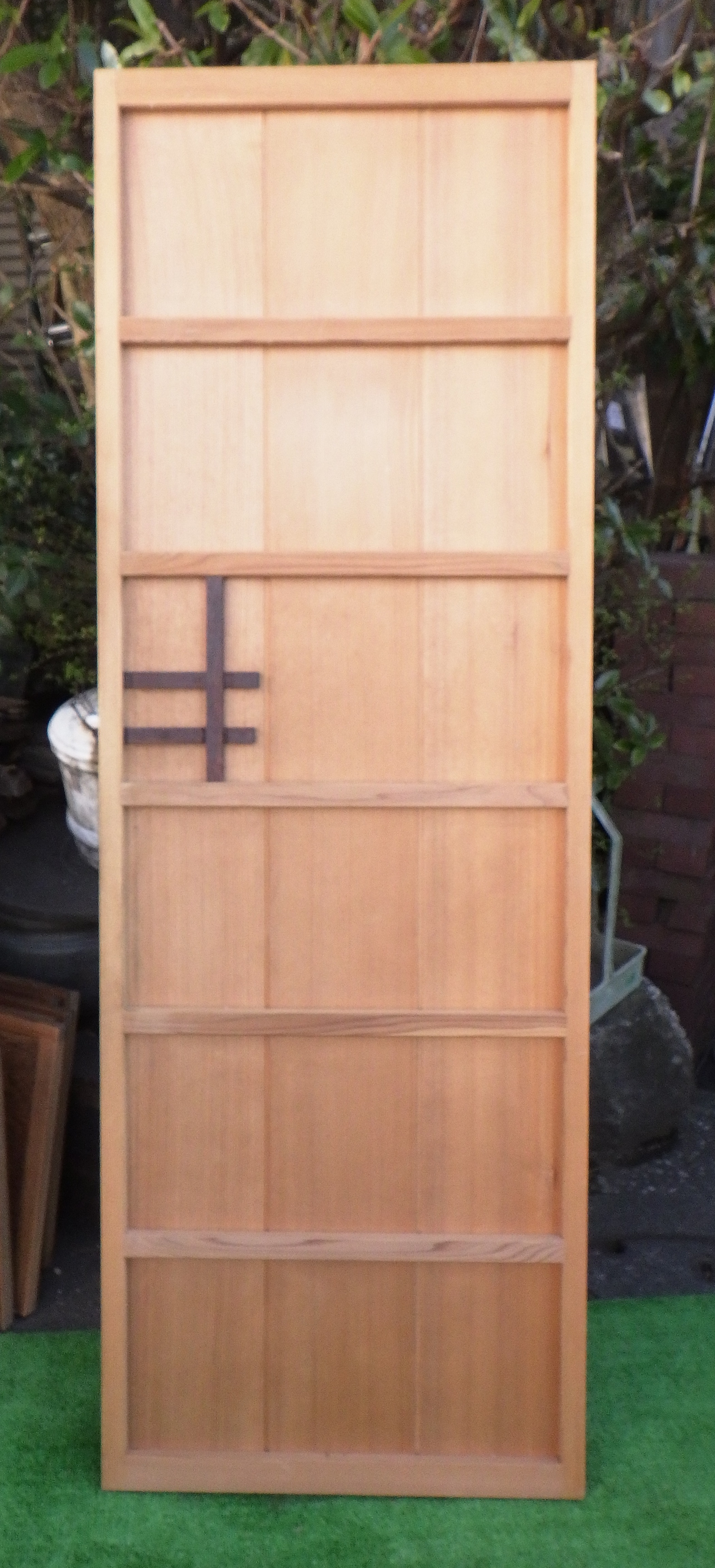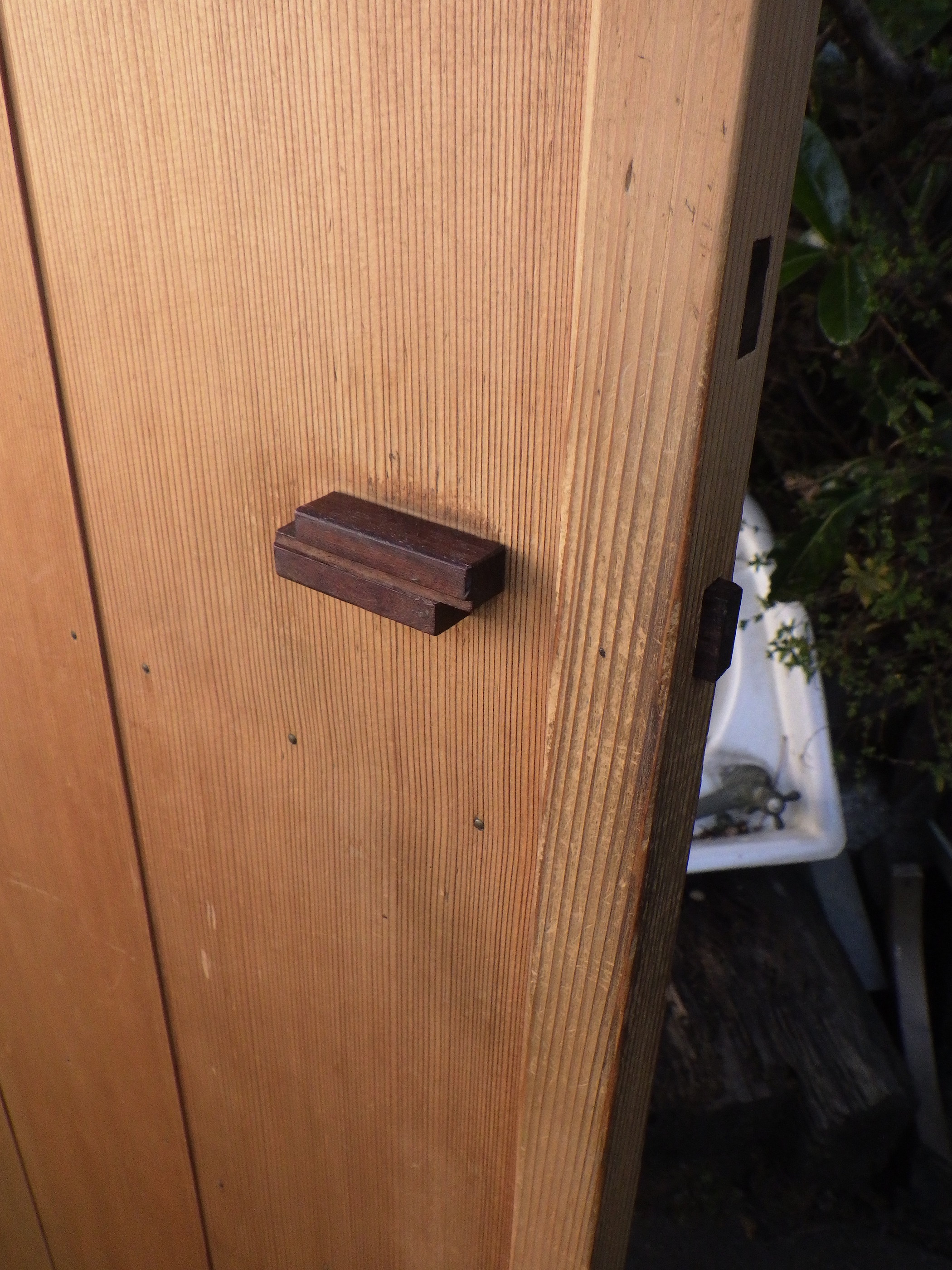 明るい色味の板に濃い色の取っ手が付いておりアクセントになっています。東京の多摩の民家で使われていたものです。