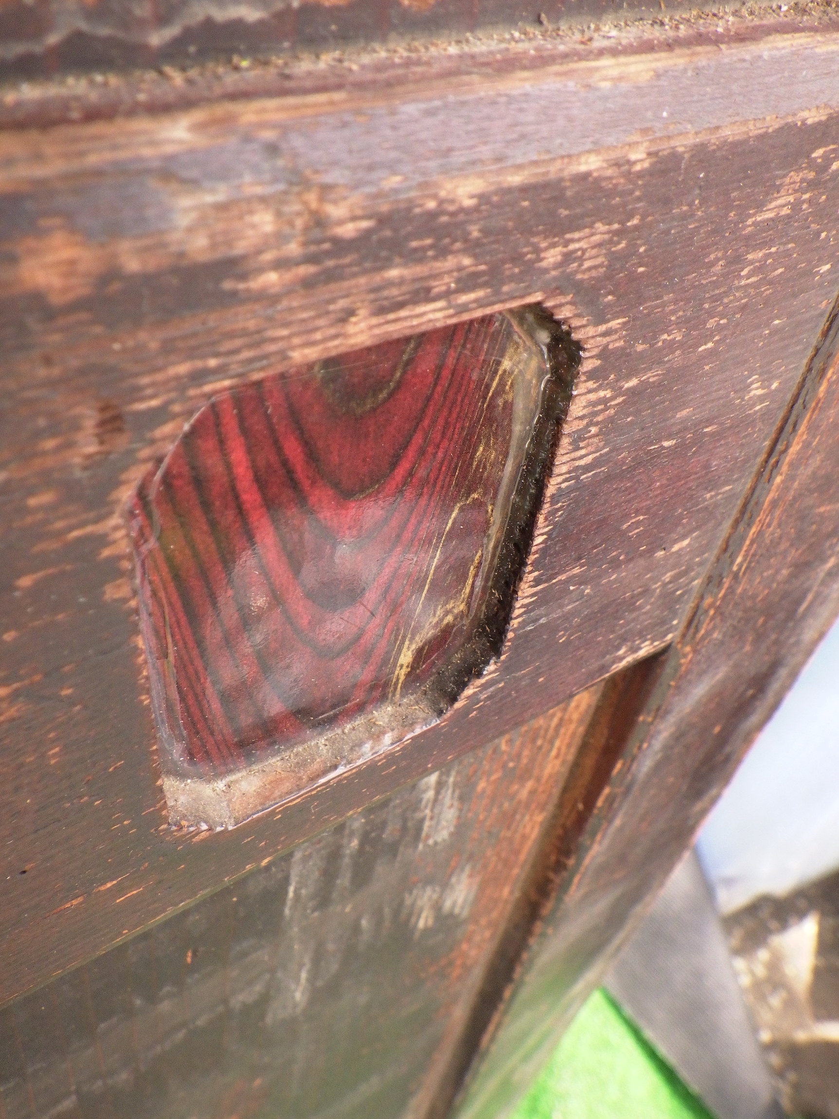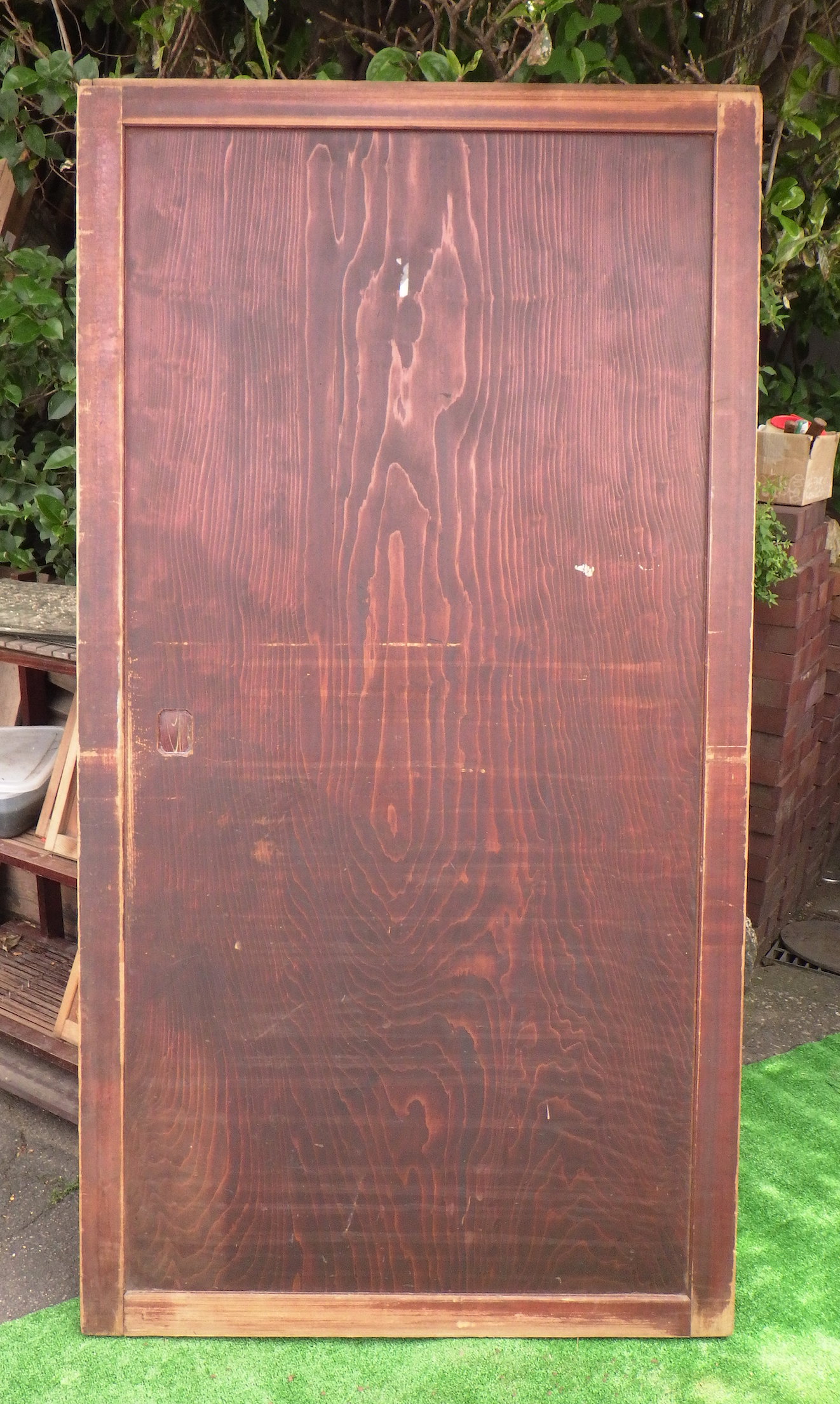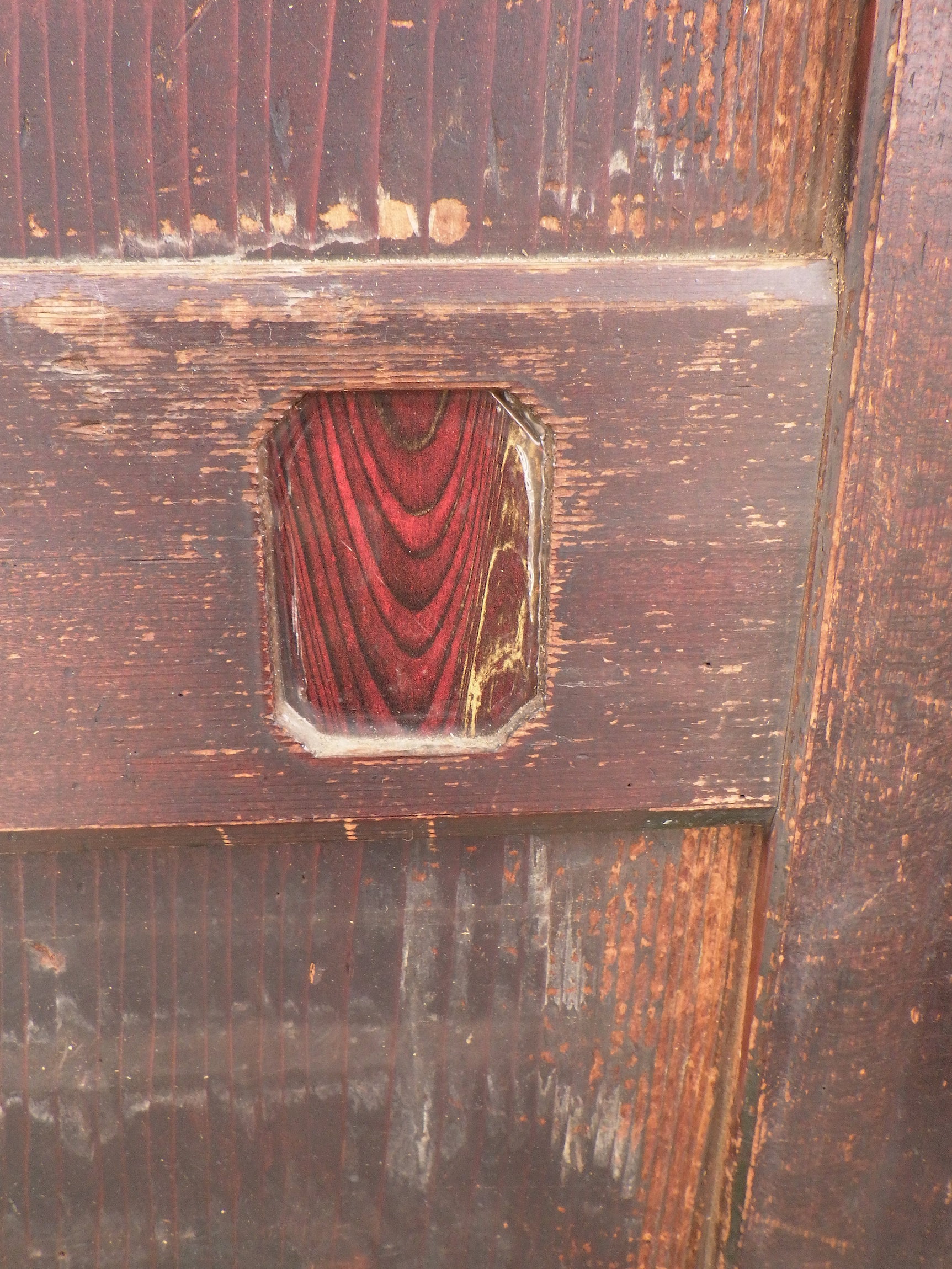 わけあり品。引き手は嵌め込まれておらず、木目調のデザインになっています。割れている箇所やキズが見られるので要修理のお品物です。埼玉の深谷の民家で使われていたものです。
