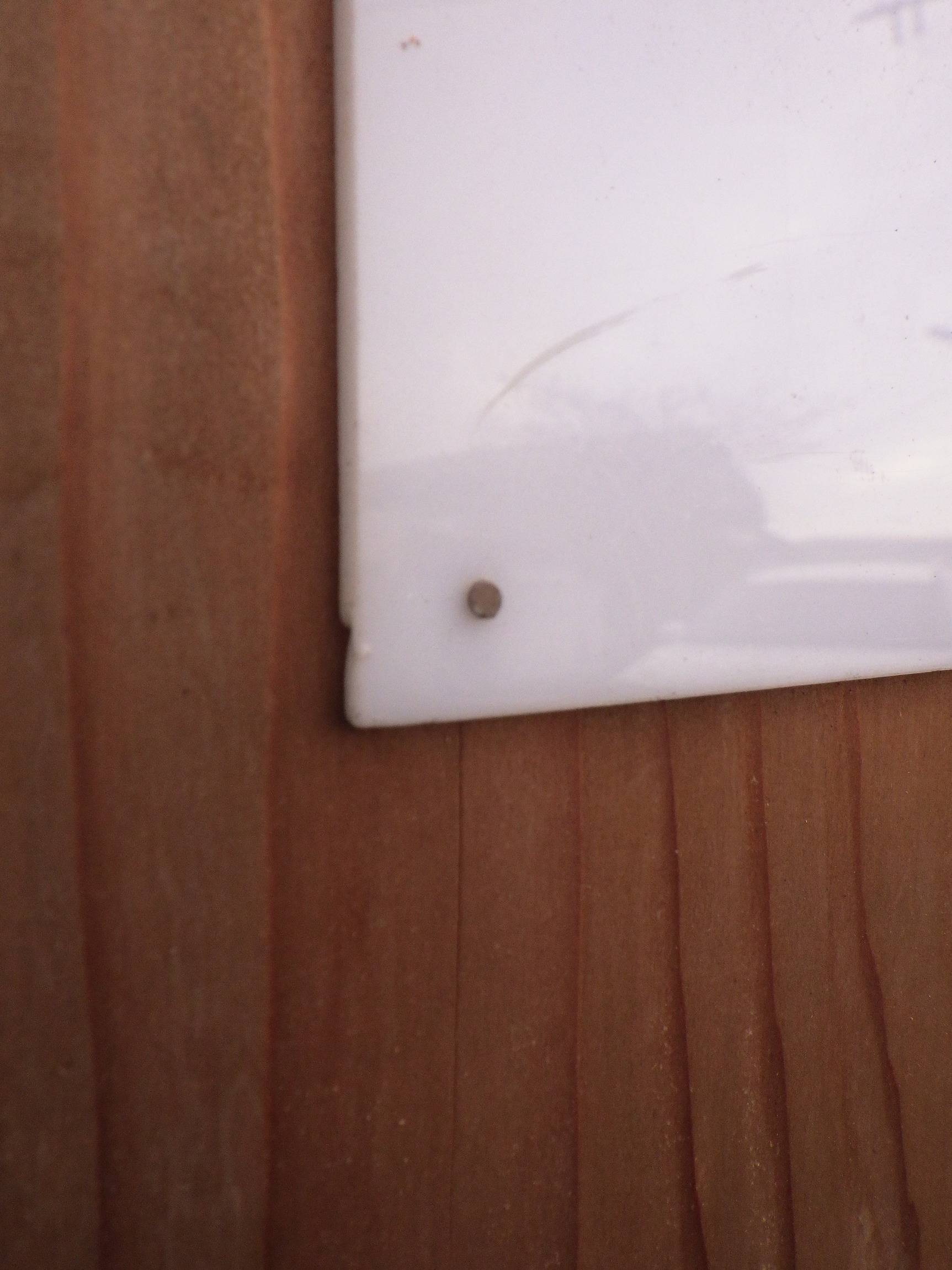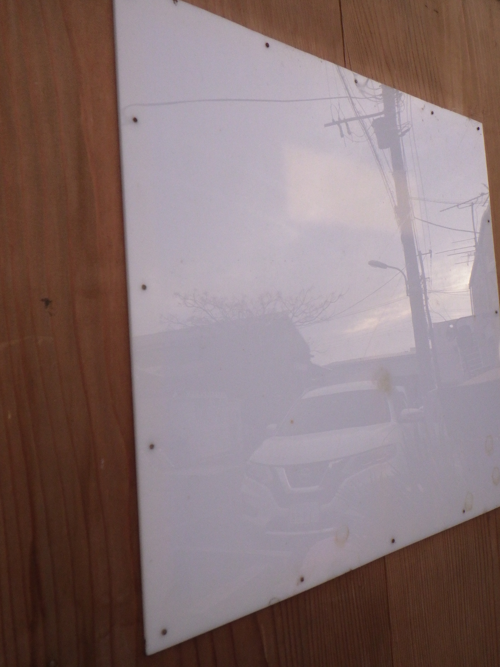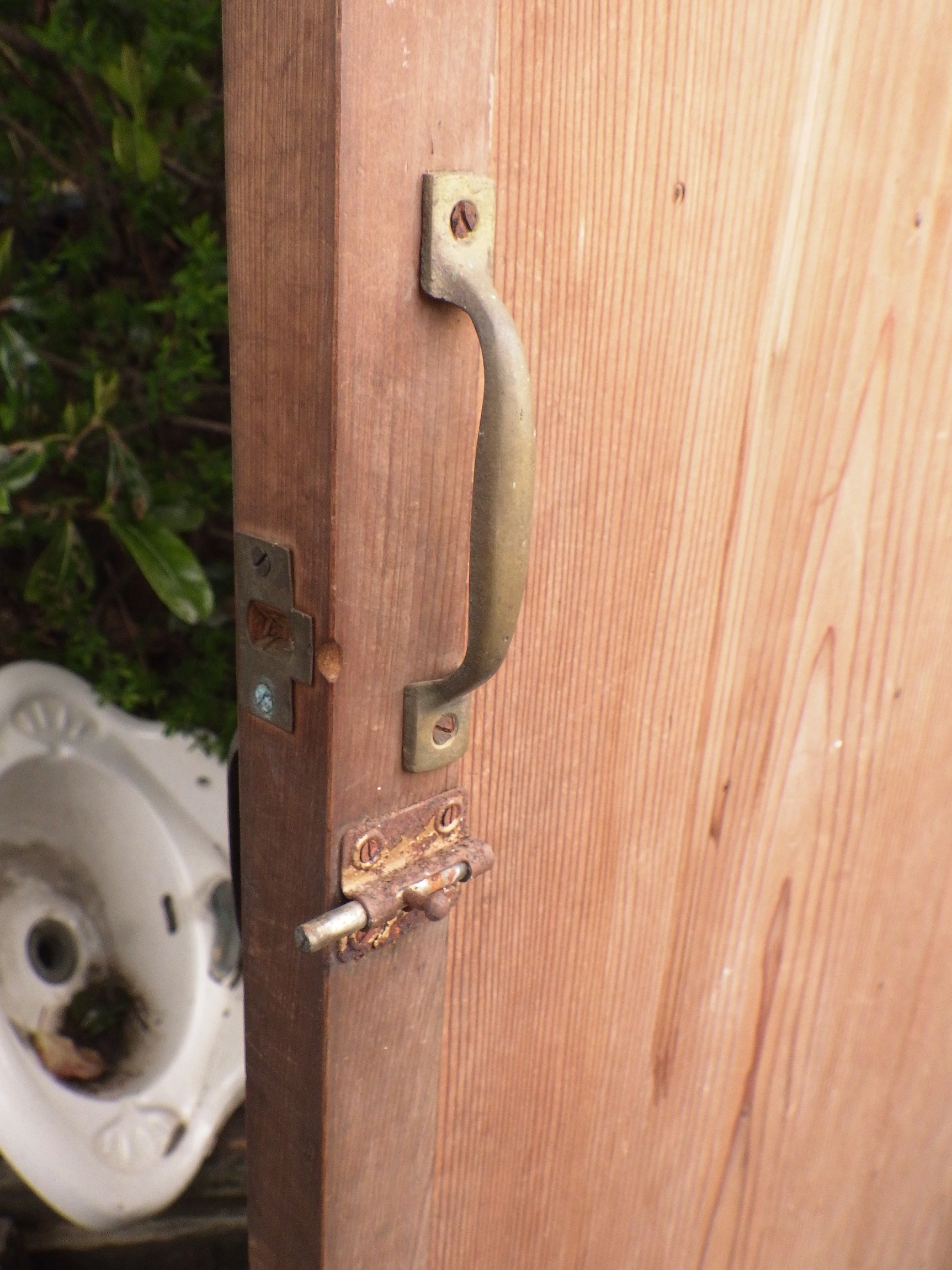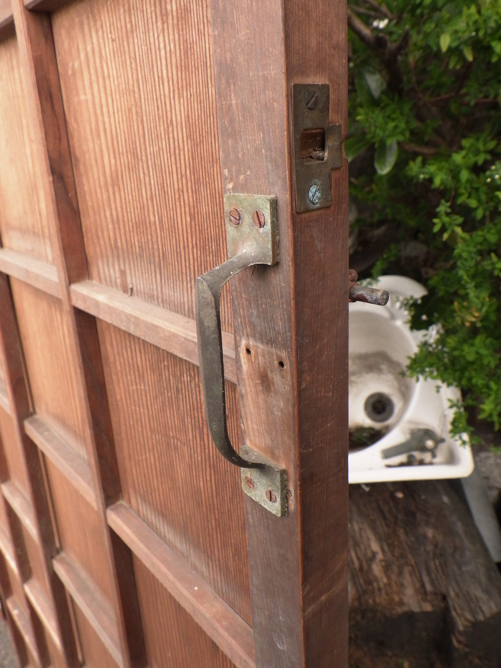 わけあり品。格子の一部に浮いている箇所がございます。格子窓には白いプラスチックの板が釘打ちされています。取っ手の下にスライド式の小さな鍵がついています。