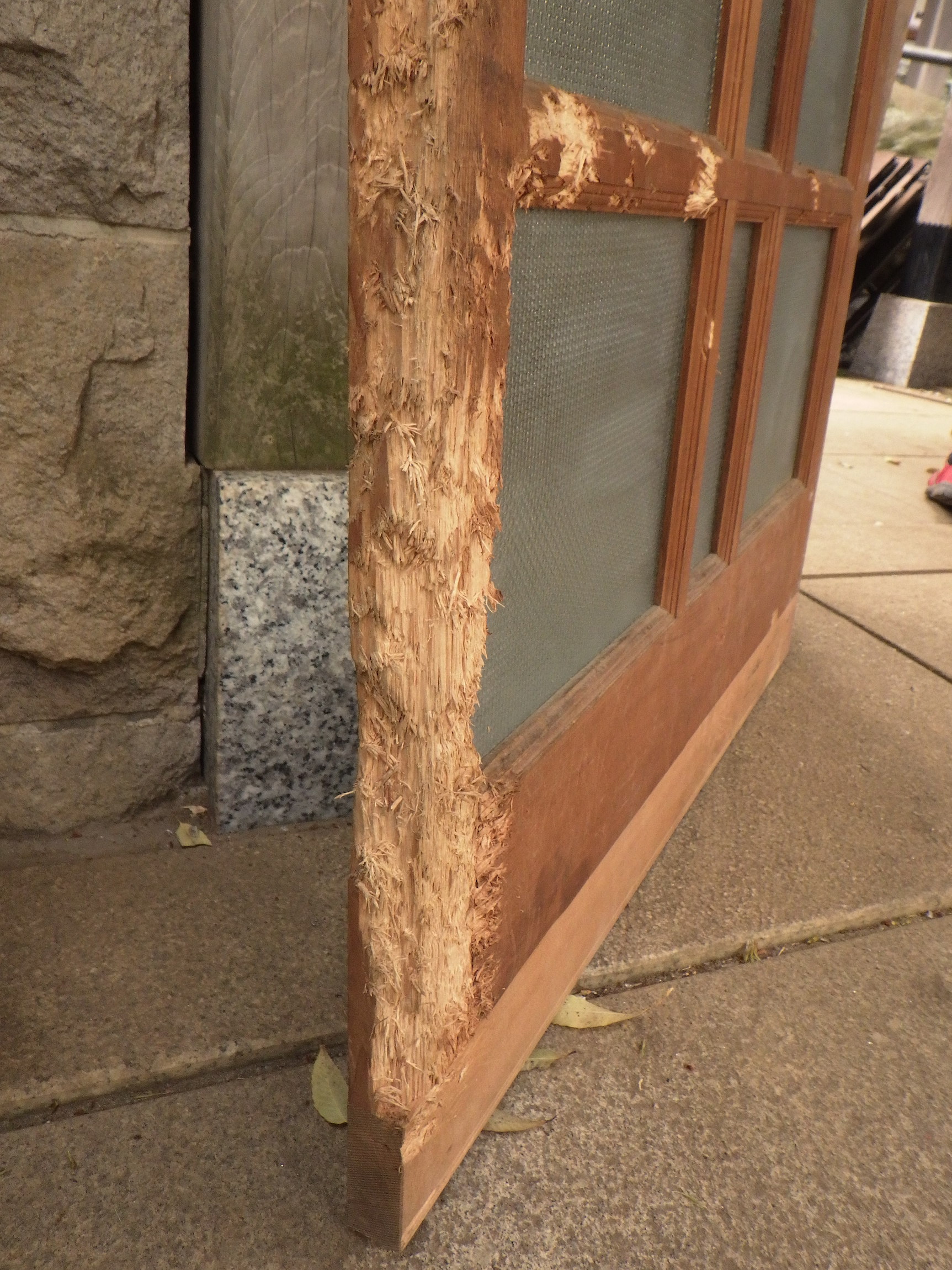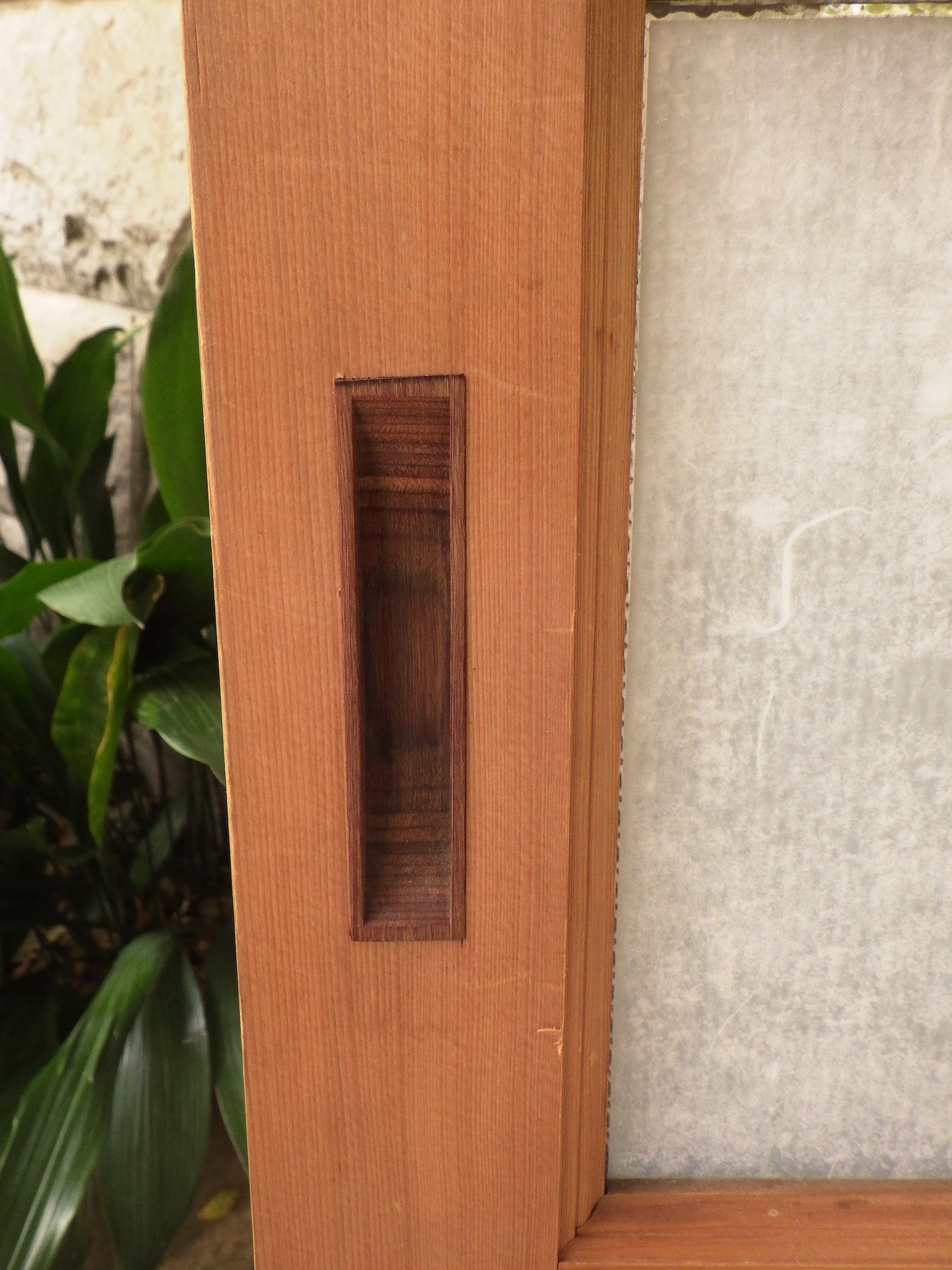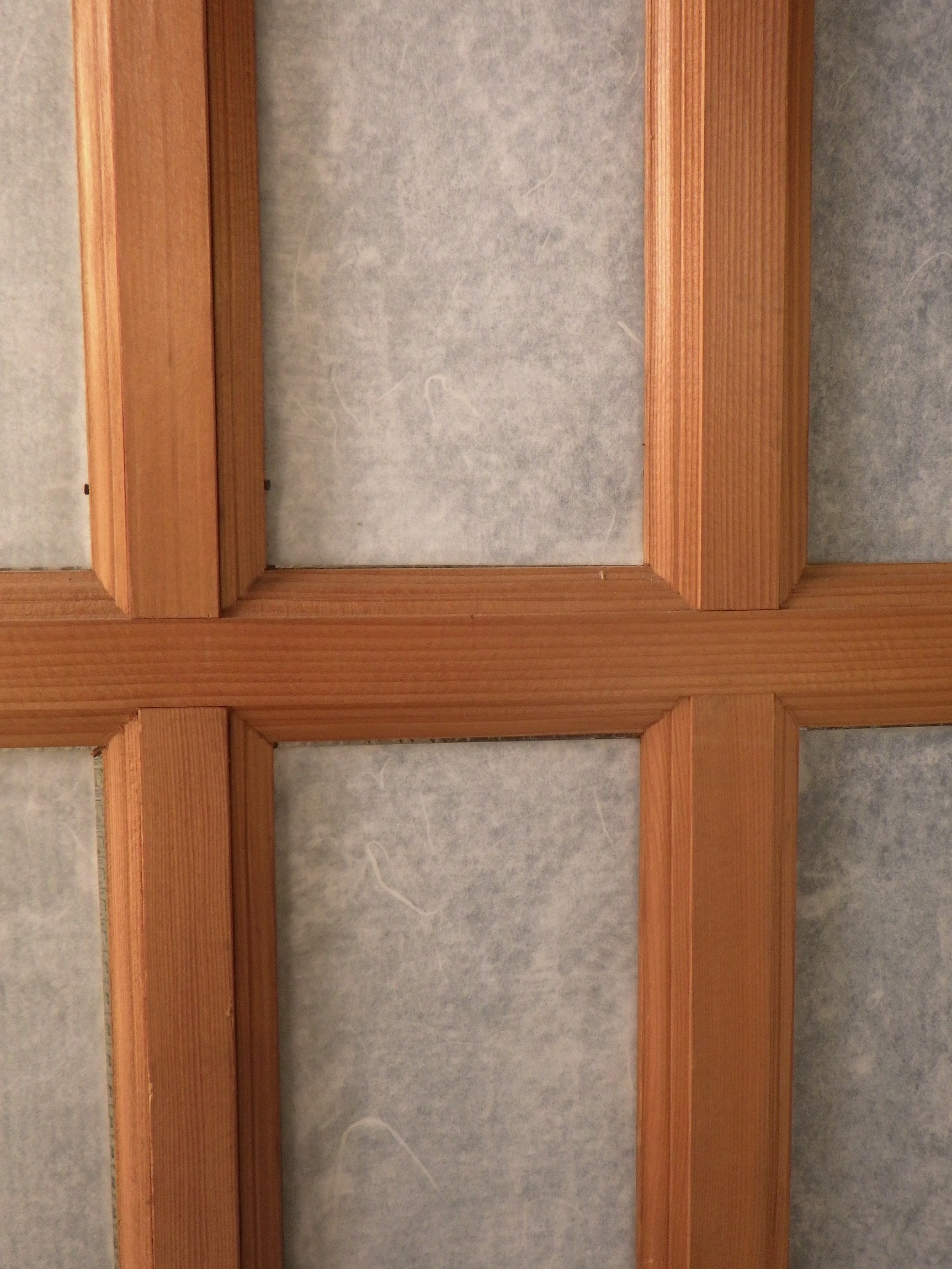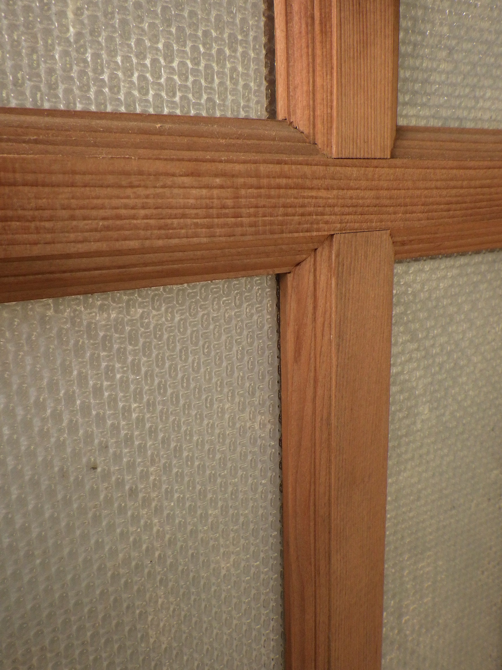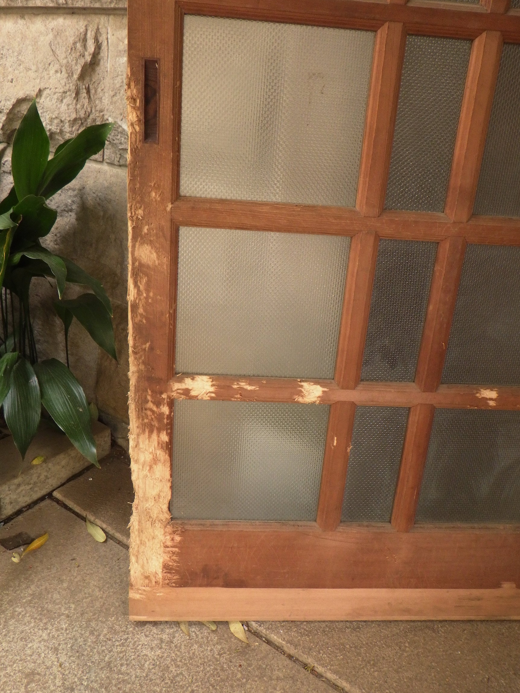 東京の世田谷区の民家で使われていたものです。ダイヤガラスが使われていますが、片面に和紙風の目隠しシートが貼り付けられています。在庫のうち2枚は幅が910mmで桟に傷みがあるため、価格は半額となります。