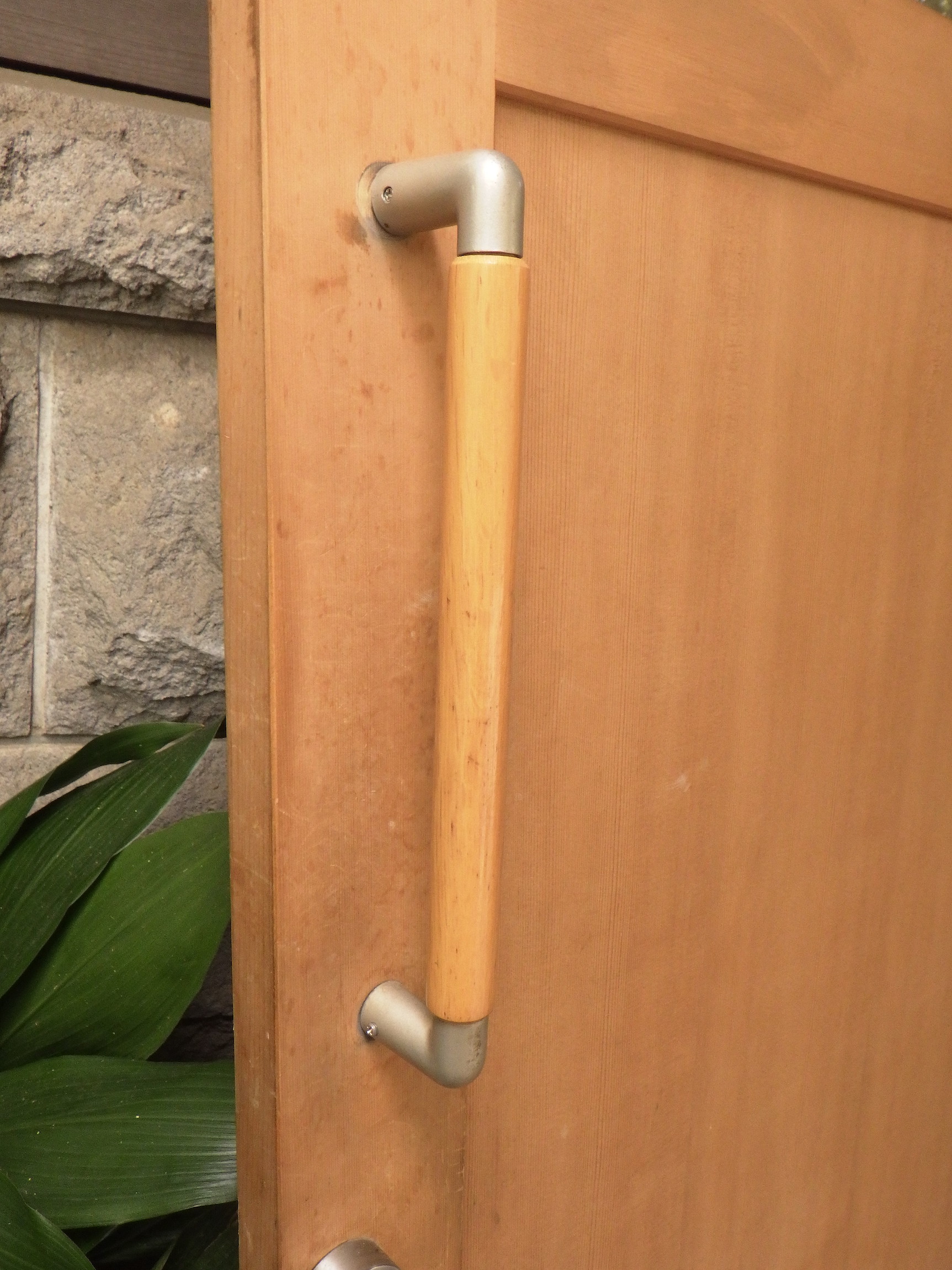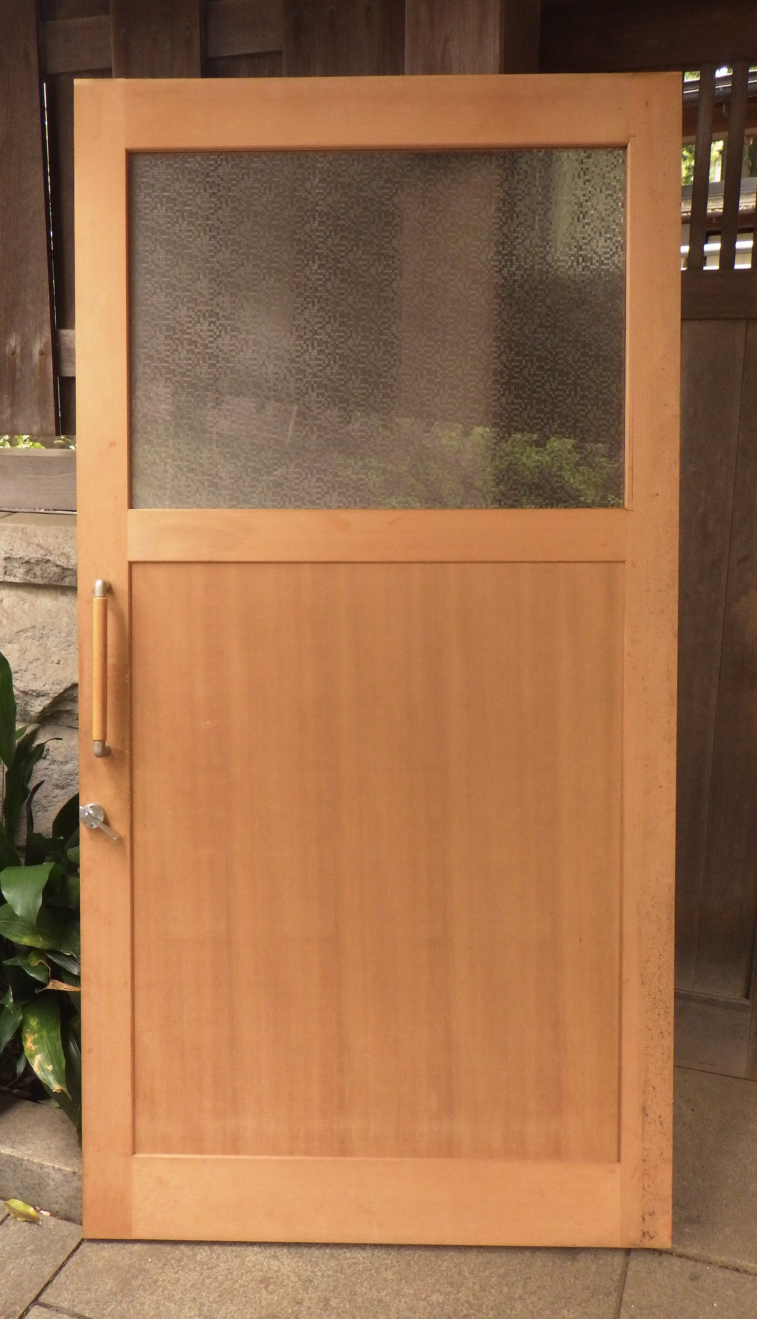取手付きの腰高ガラス戸です。模様ガラスはスクエアが連なったモダンなデザインのものが使われています。大きなわかりやすい鍵もついています。高さもありますので店舗のリノベーション等にもお使い頂けそうです。