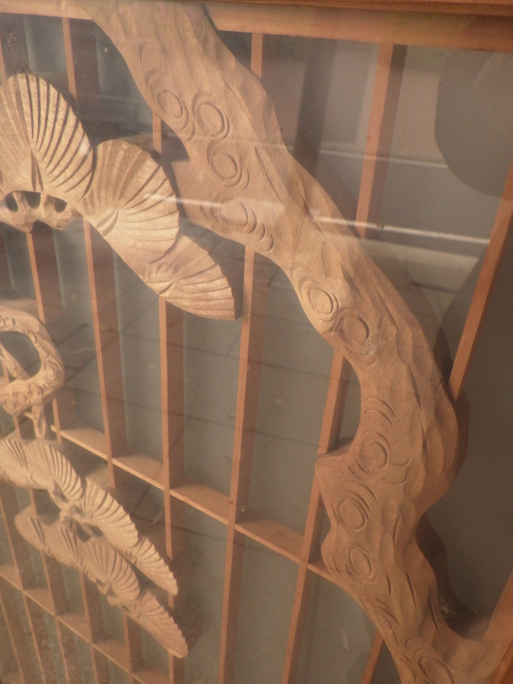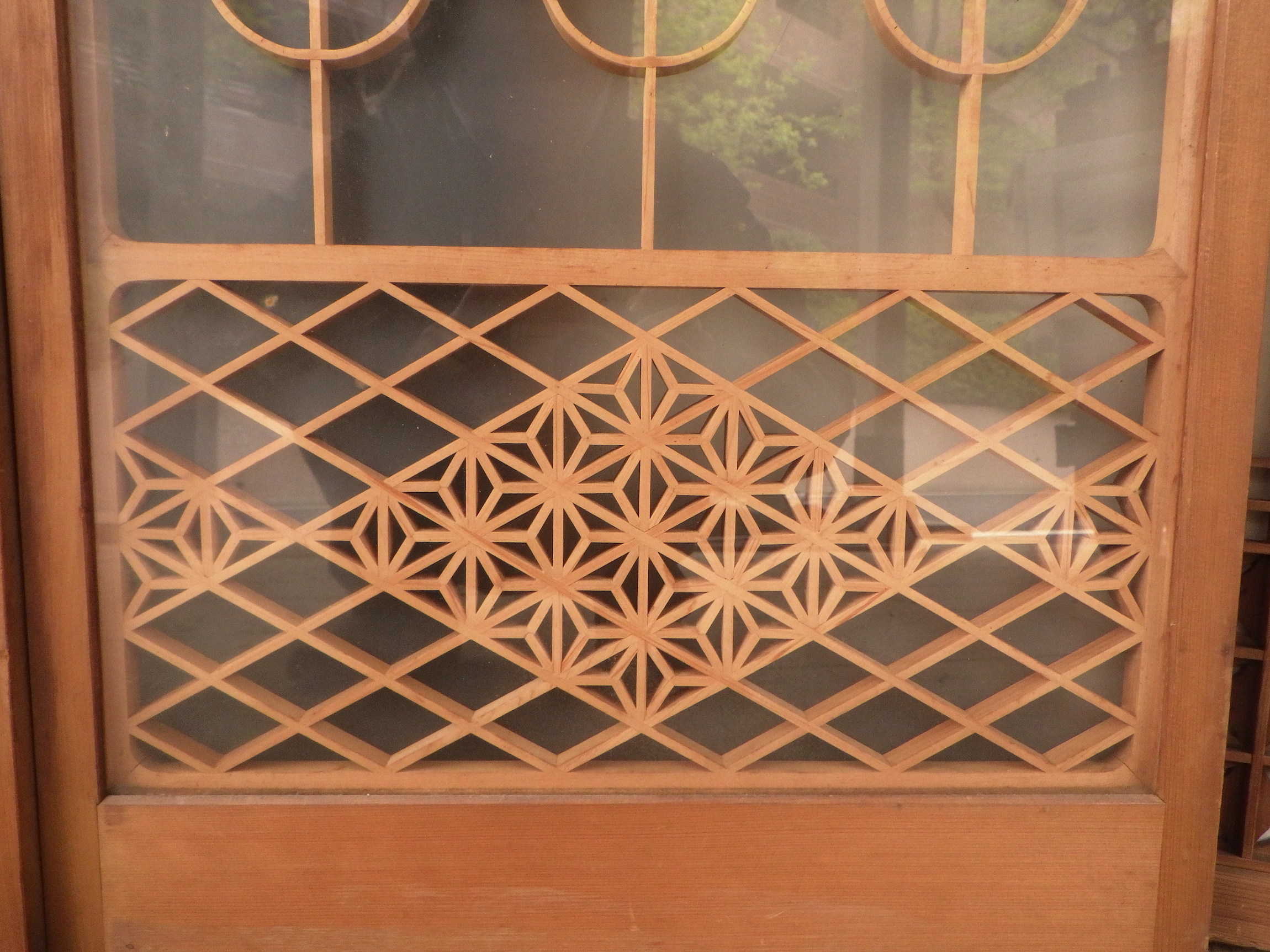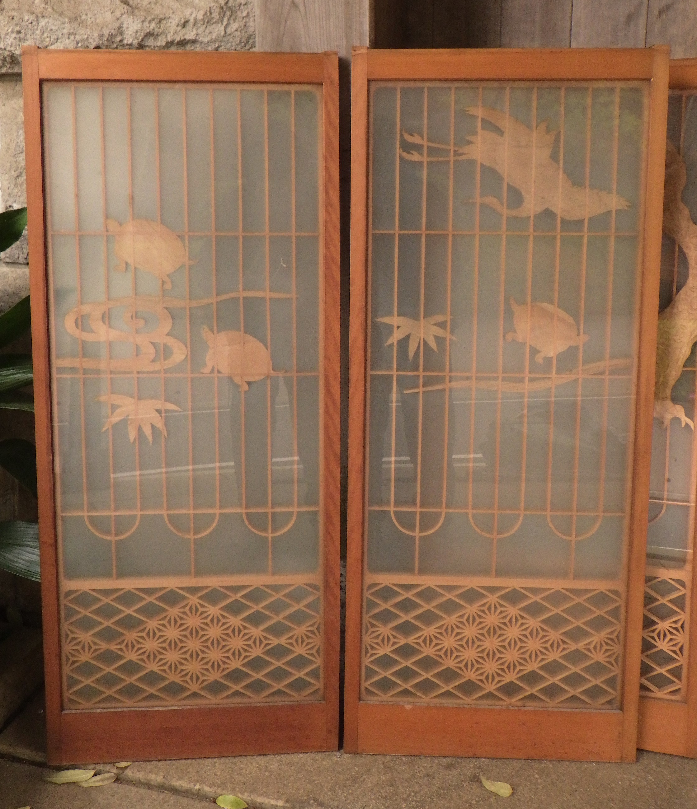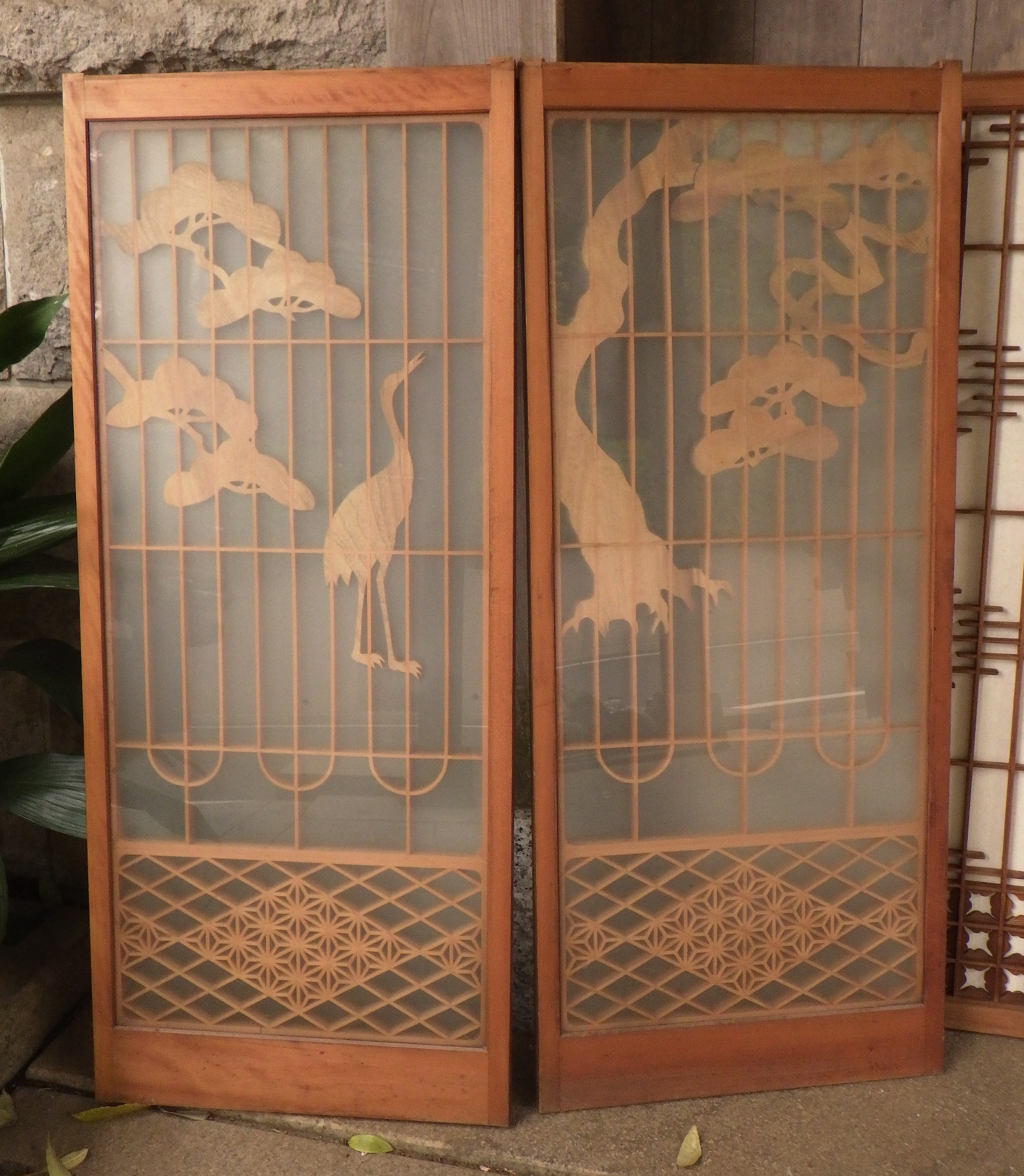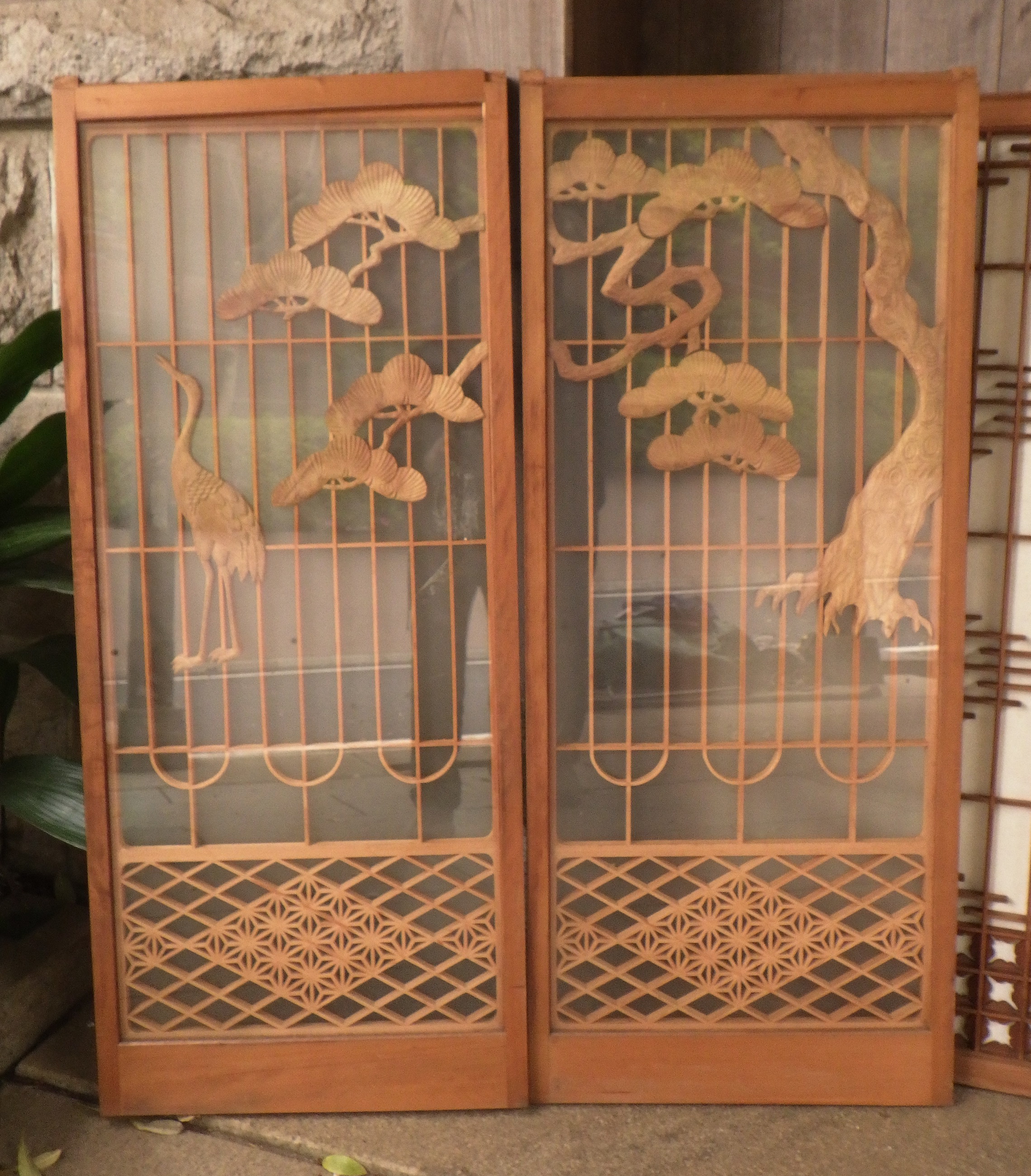 東京の世田谷区の民家で使われていたガラス入りの書院障子戸です。片面が曇りガラスですので向こう側が透けて見えません。彫刻は鶴亀や松など、縁起のいい絵柄になっています。写真は2枚並べて撮影していますが、値段は一枚あたりで表示しています。