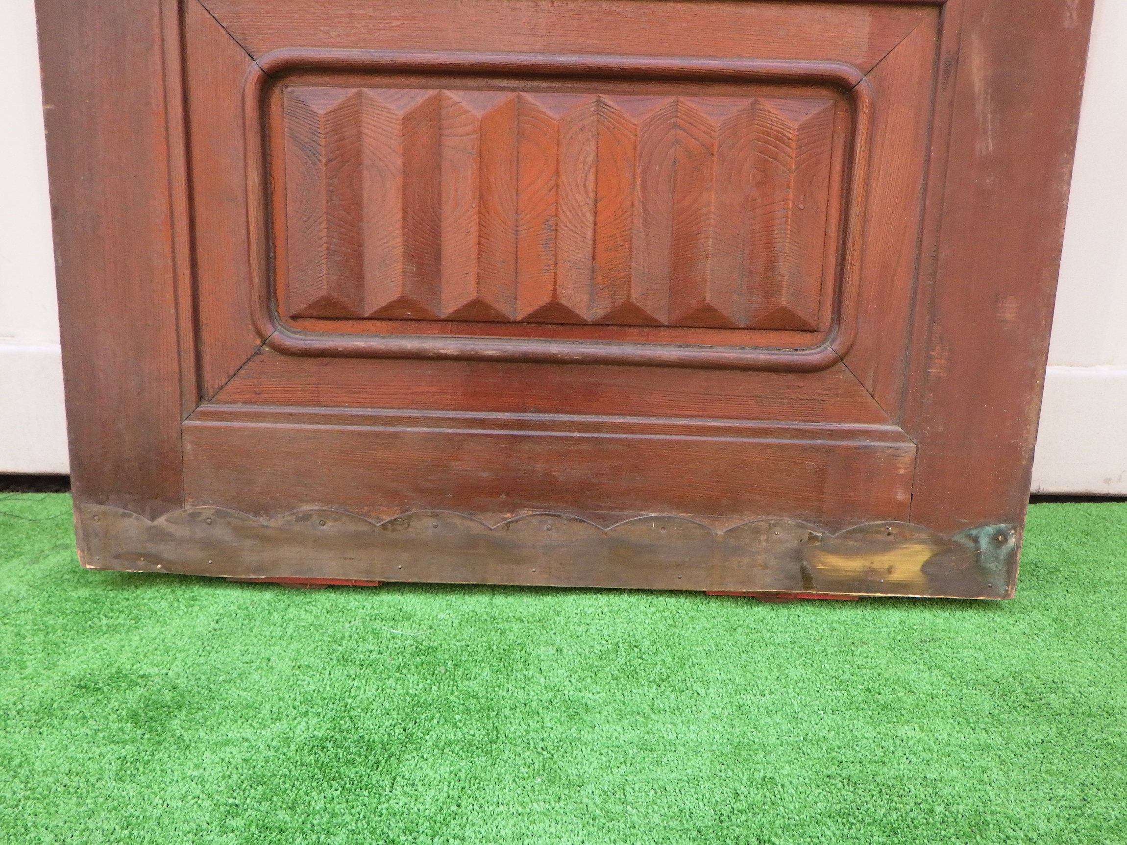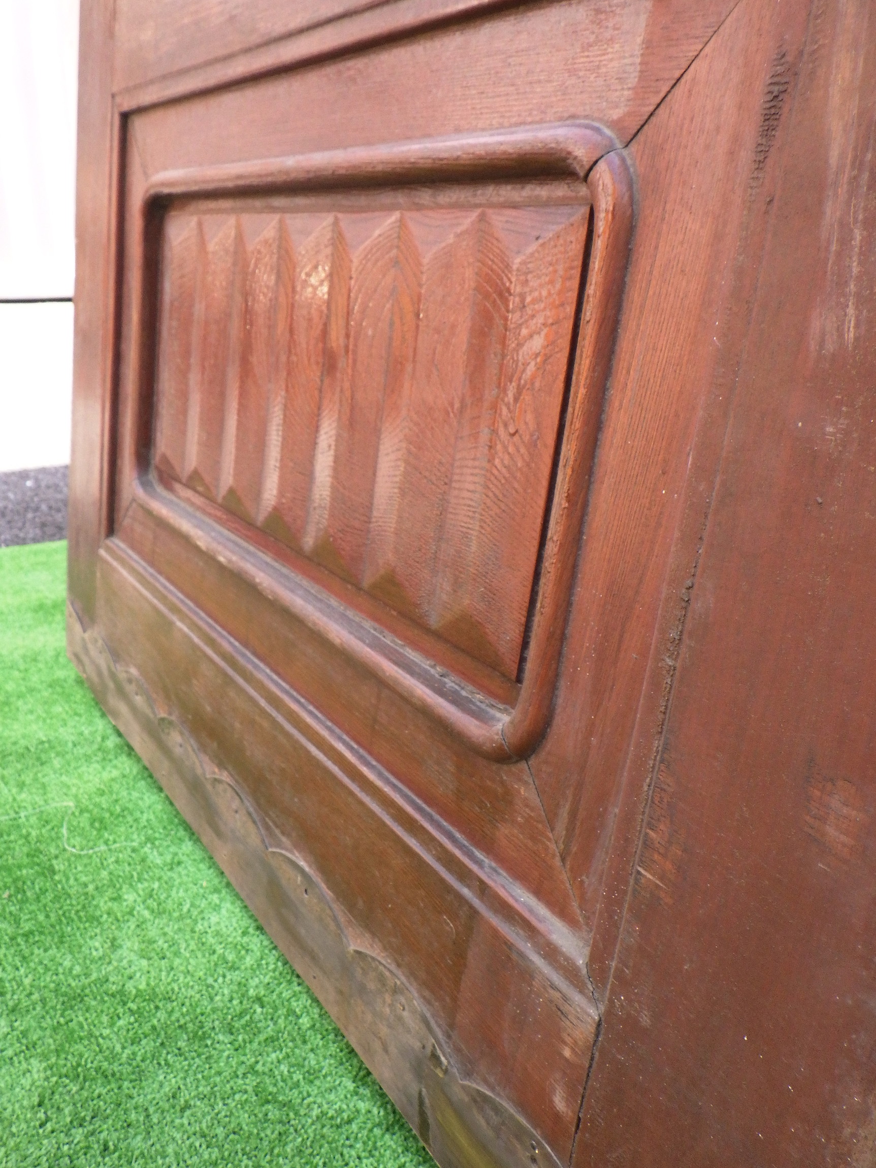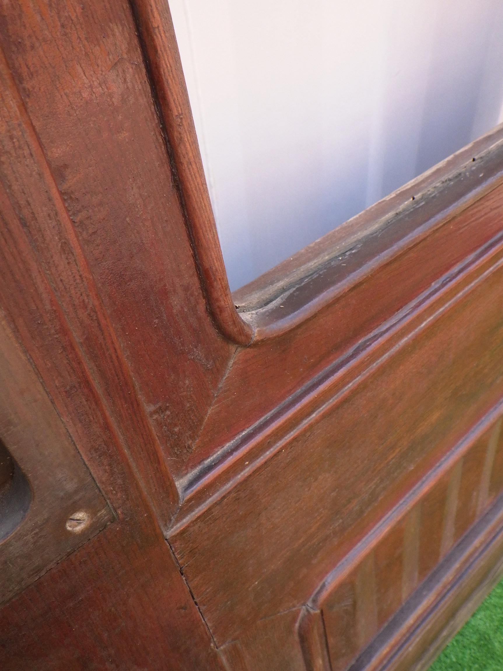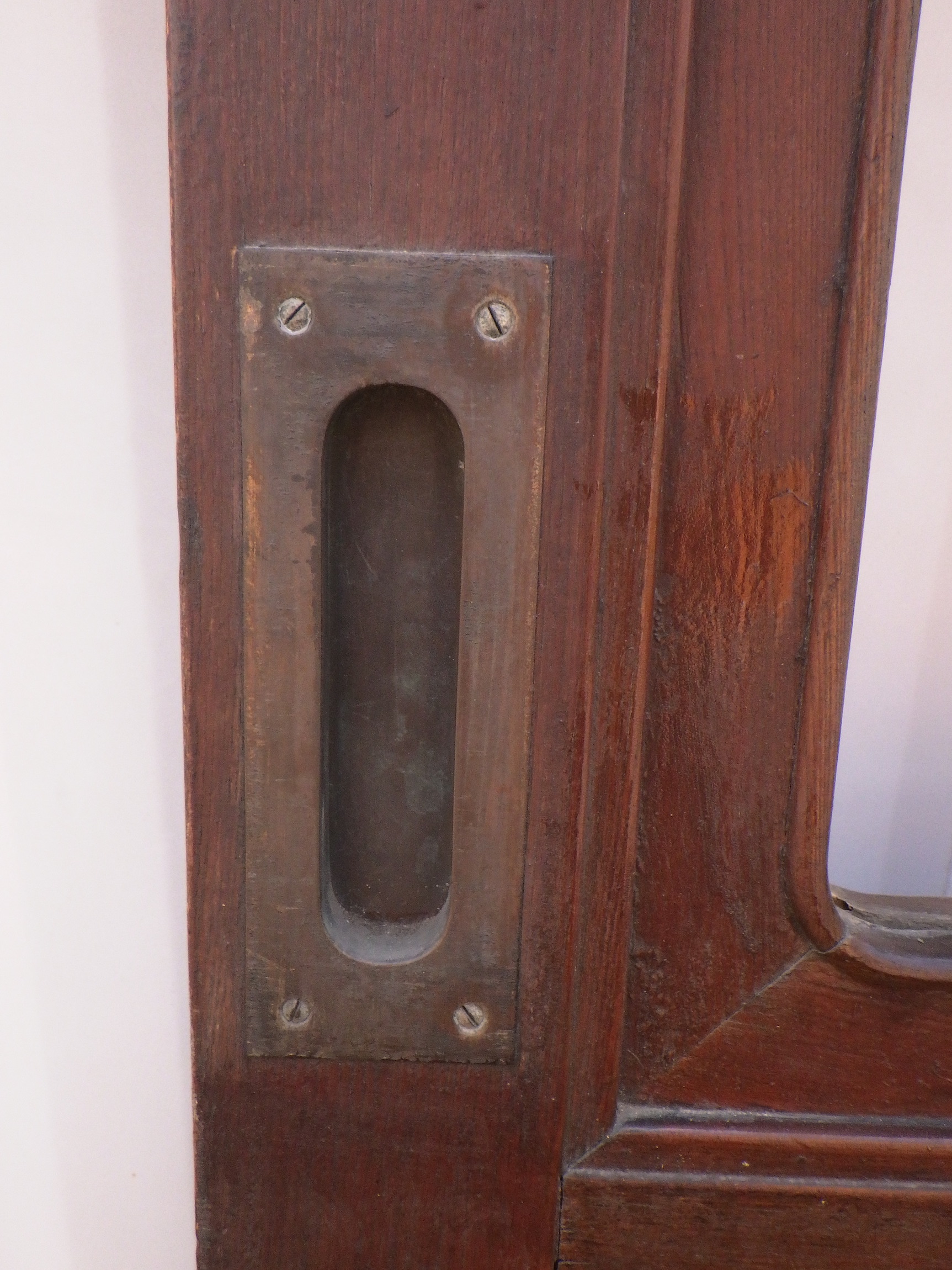 腰付きガラス戸です。引き戸にも関わらず洋風ドアのような印象があります。重厚で凝ったデザインです。窓が大きいので店舗の入り口などの設置にもおすすめです。片面、腰下に金具の装飾がついています。