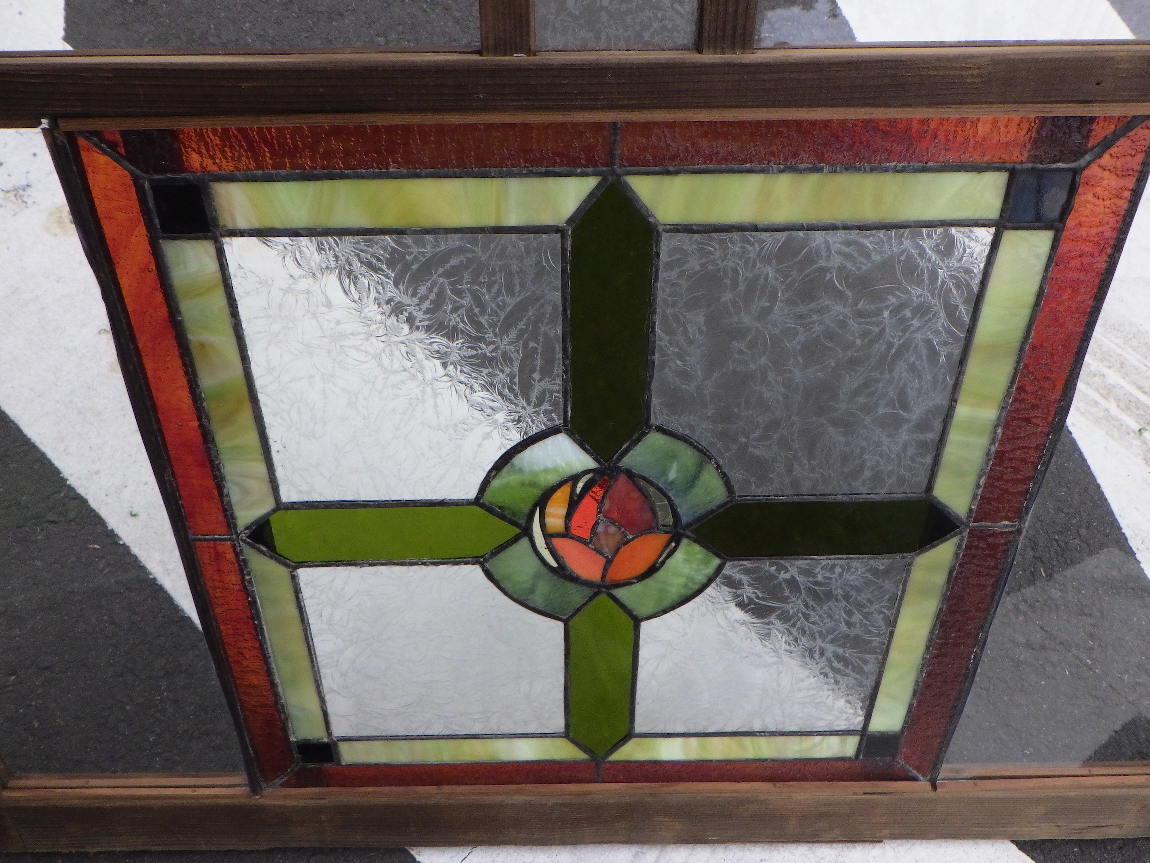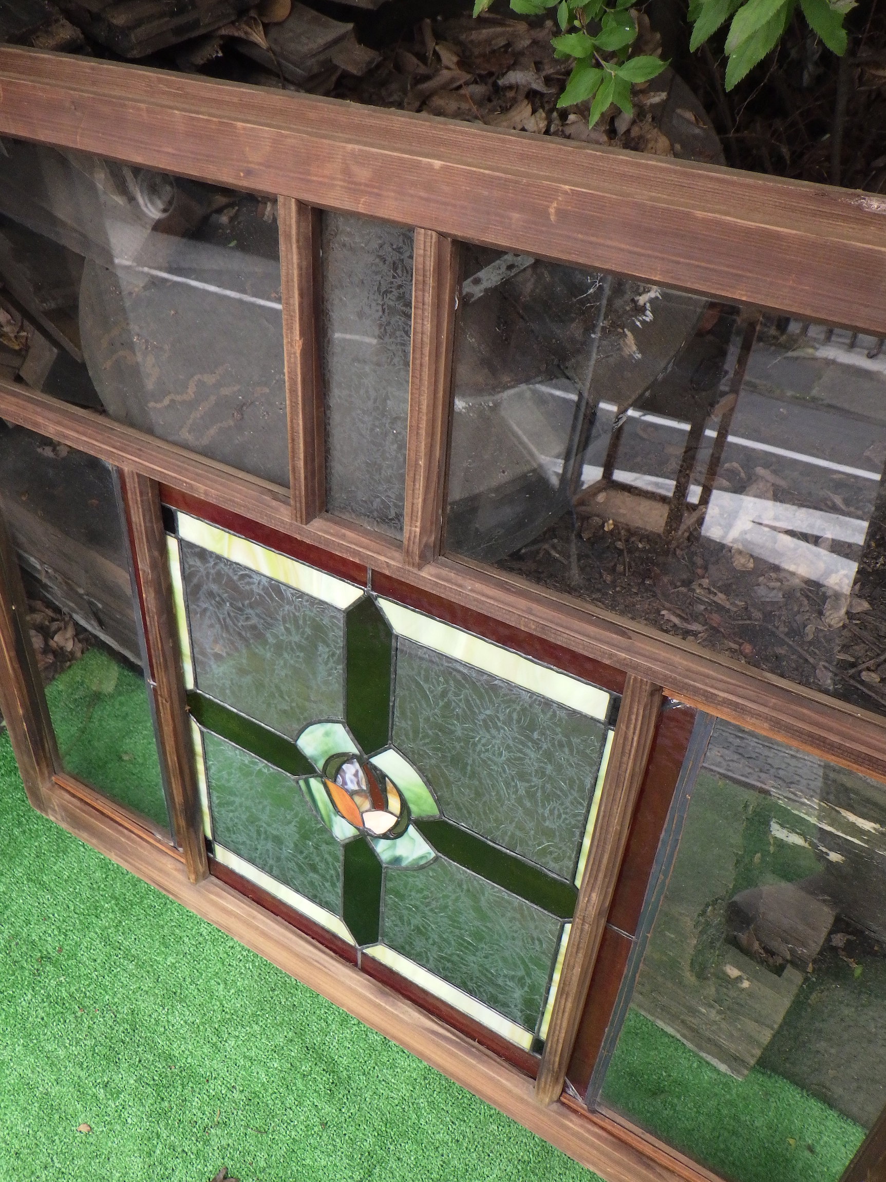 メインの緑とオレンジのカラーでは様々な種類のガラスが使われており、味わい深くどこか神聖さも感じる絵柄。それぞれの色の中にもいろいろなトーンが感じられるため、見飽きることがありません。