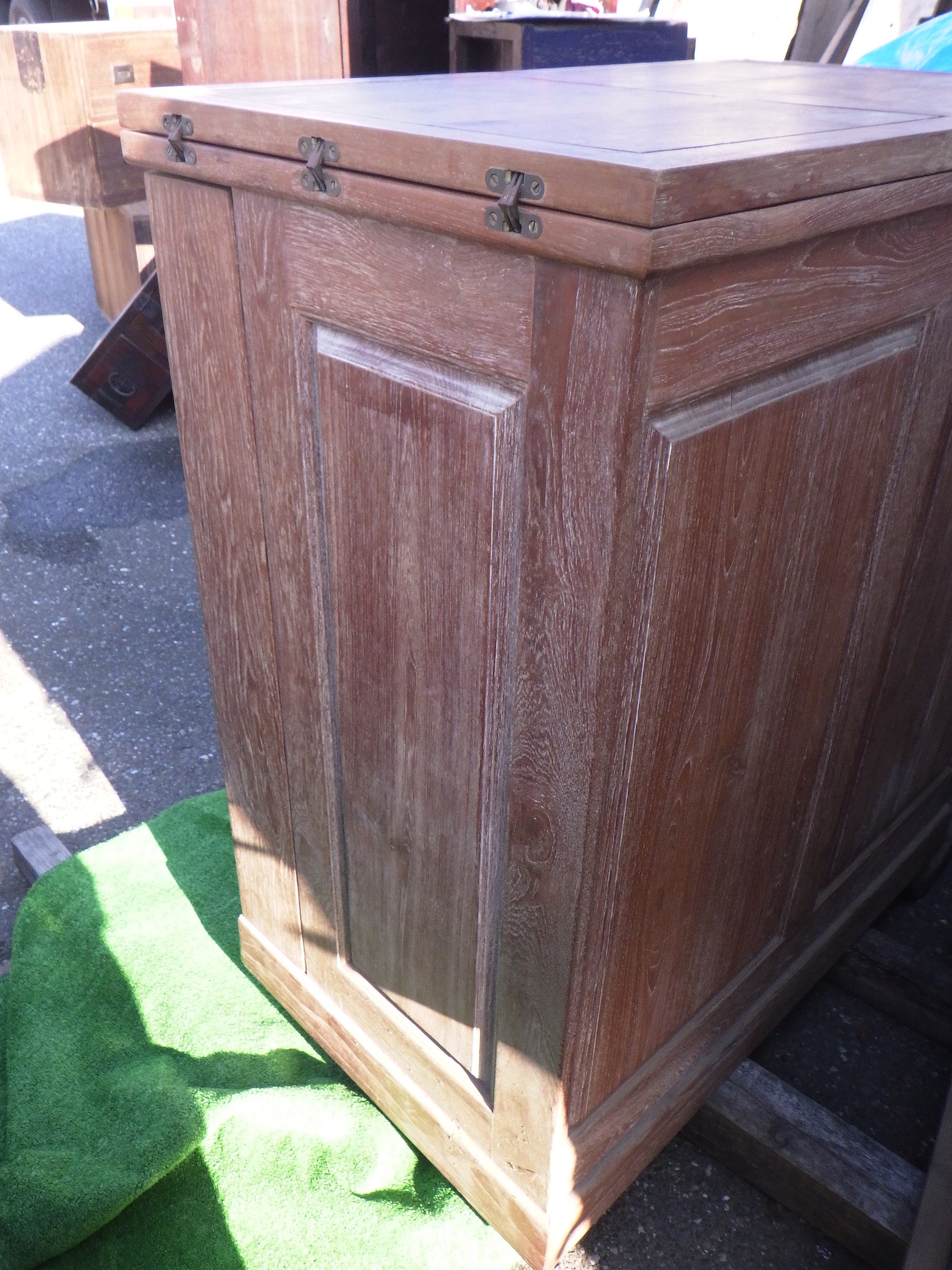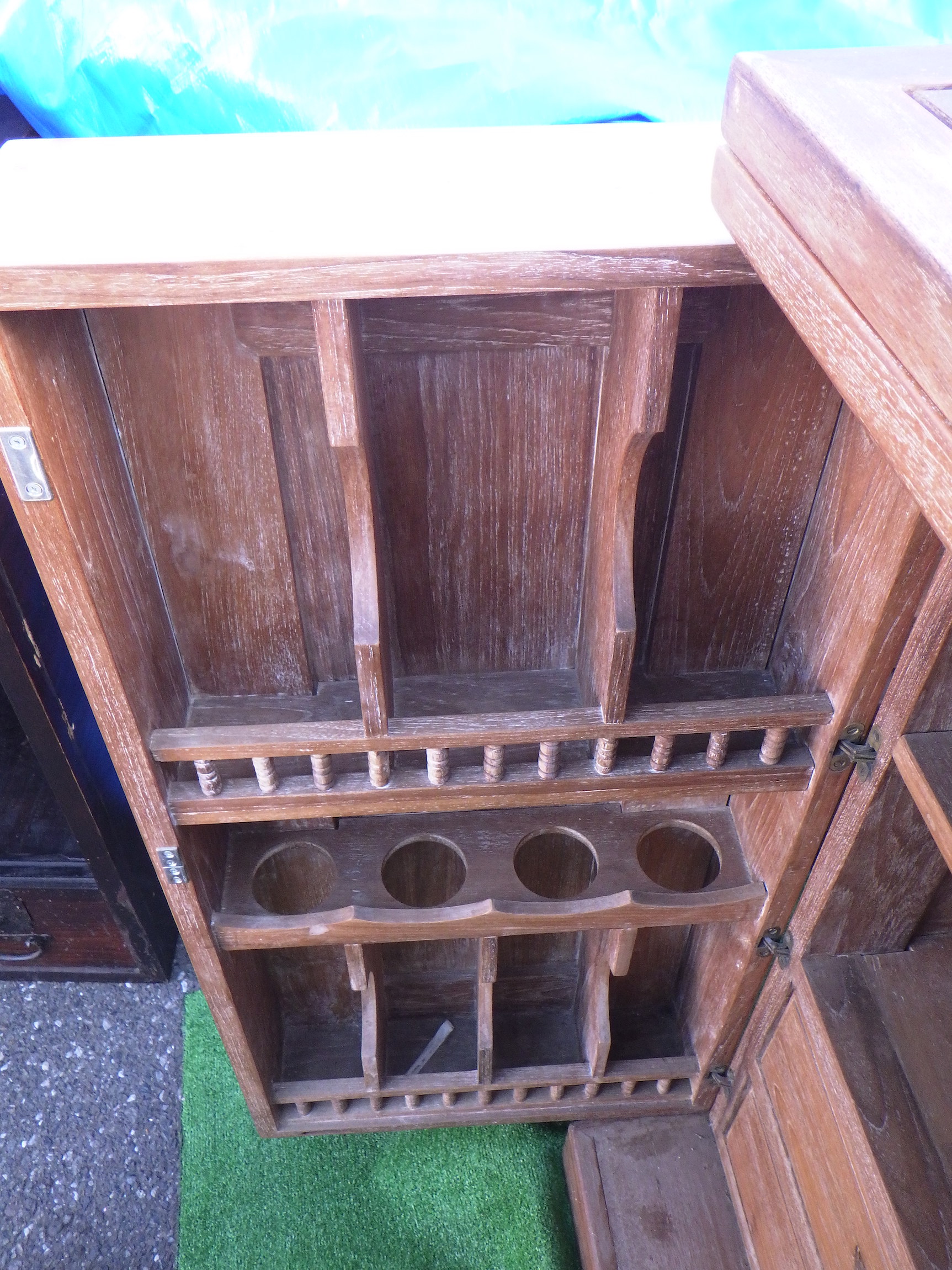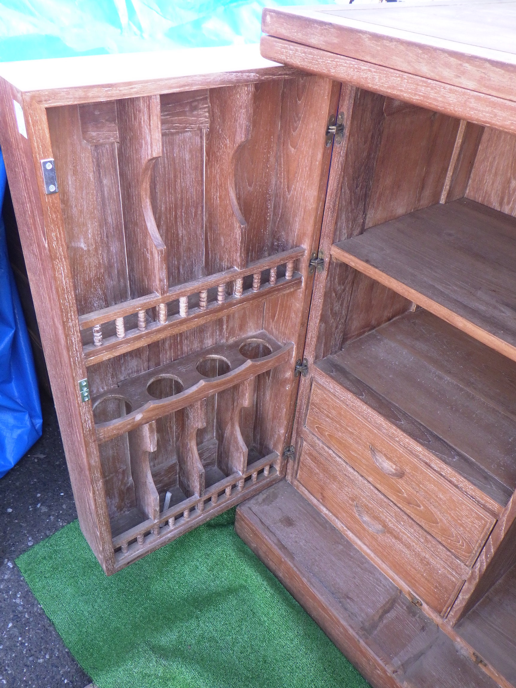 一見、戸棚のようですが、重厚な扉を開けると何本もワインをしまえる収納庫になっています。材質はおそらくチーク材と思われます。ただしまい込むのではなく、見せる収納のデザインになっているところがニクいです。天板は左右にひらきますのでちょっとしたテーブルのように使うこともできると思います。(開くと1825mm)素材にしても、デザインにしてもちょっと珍しいお品と言えそうです。