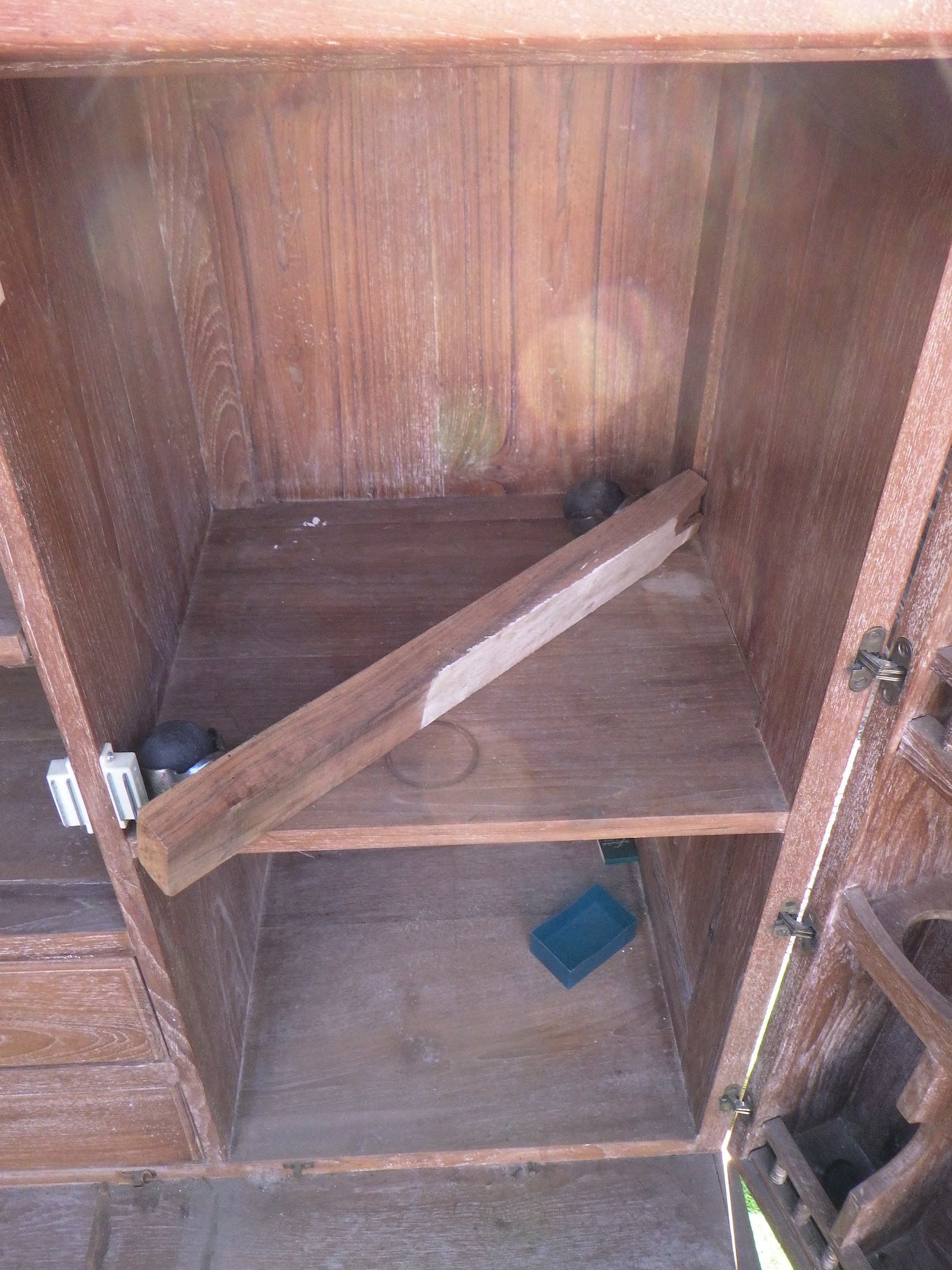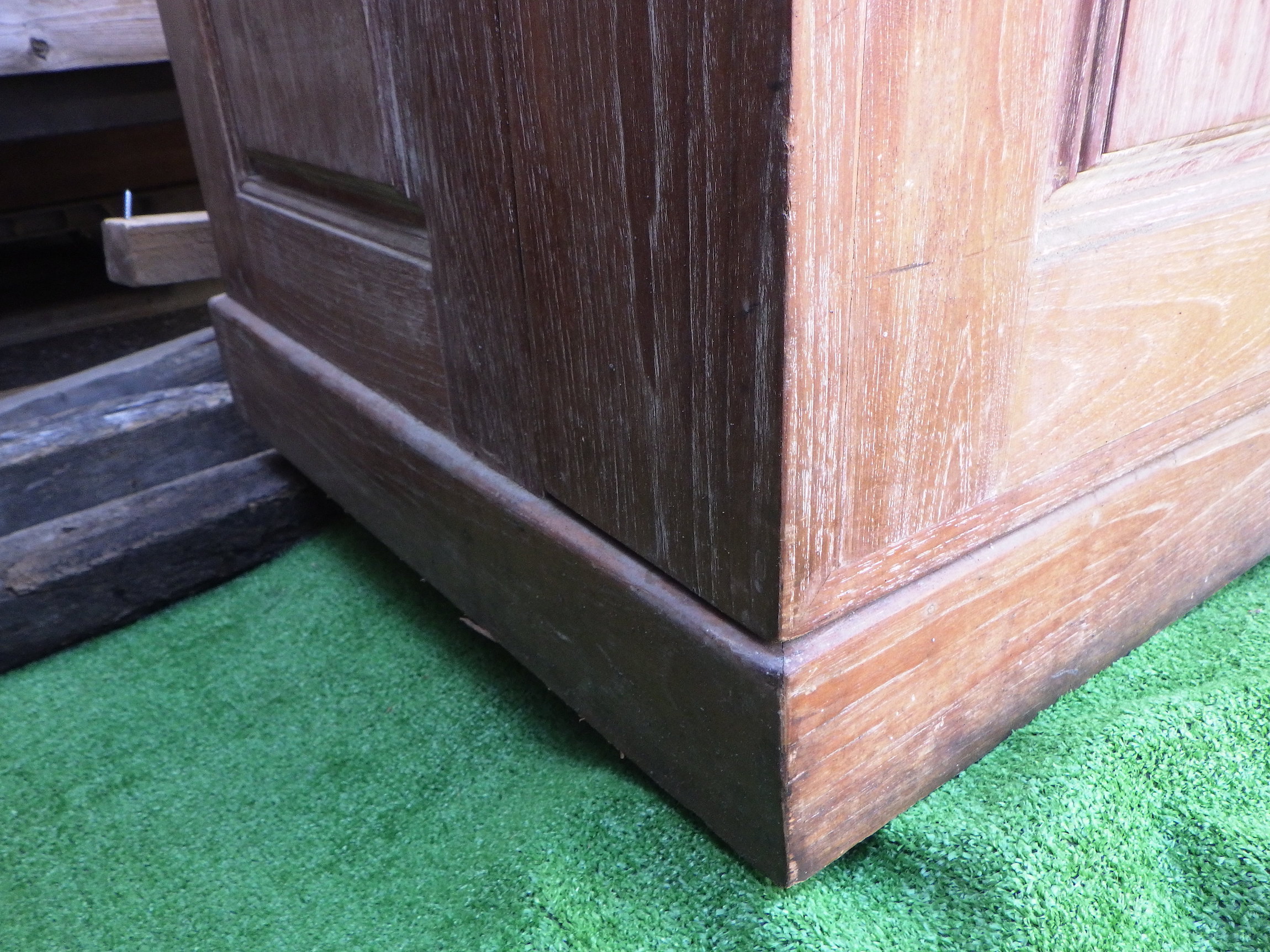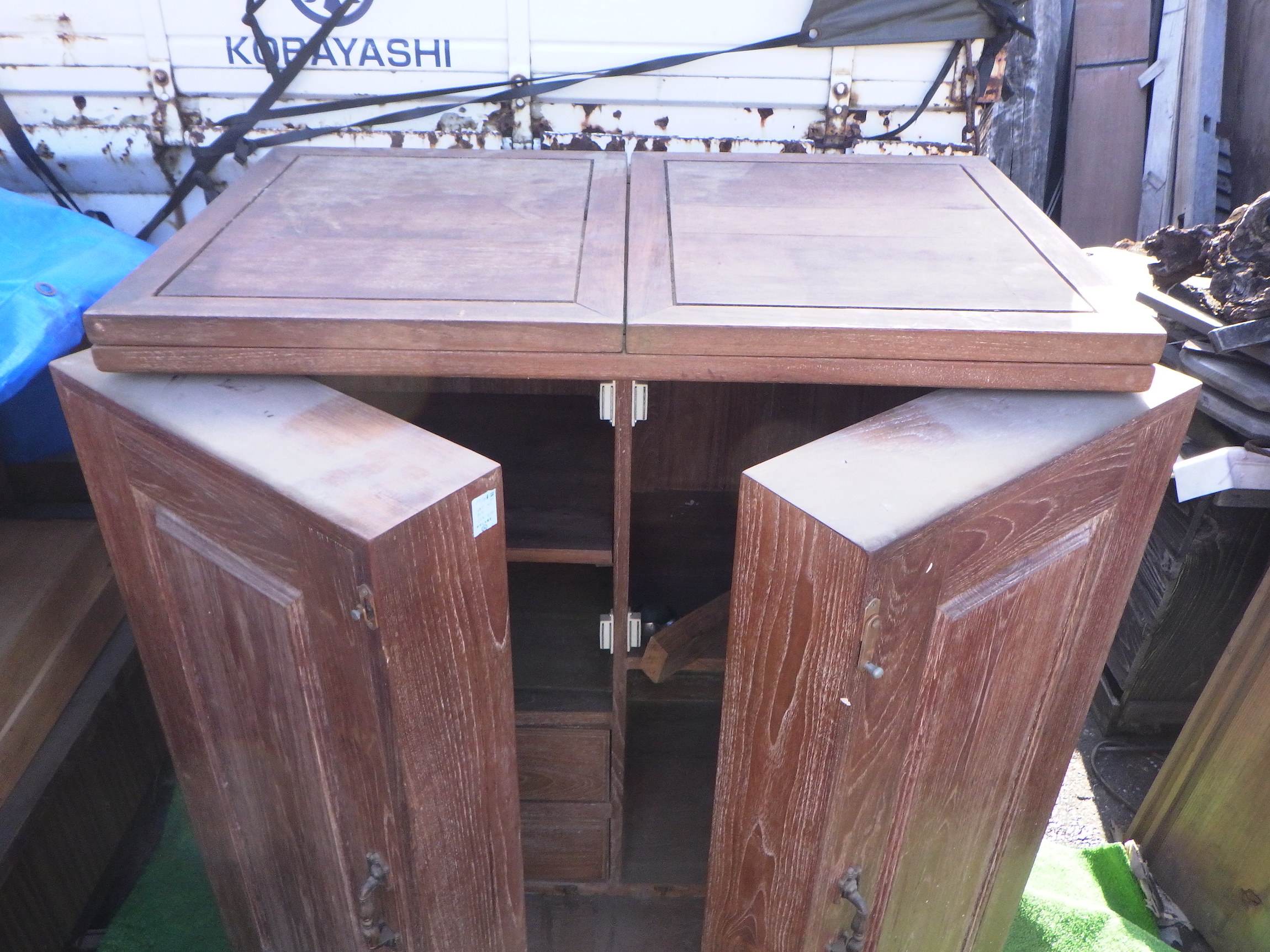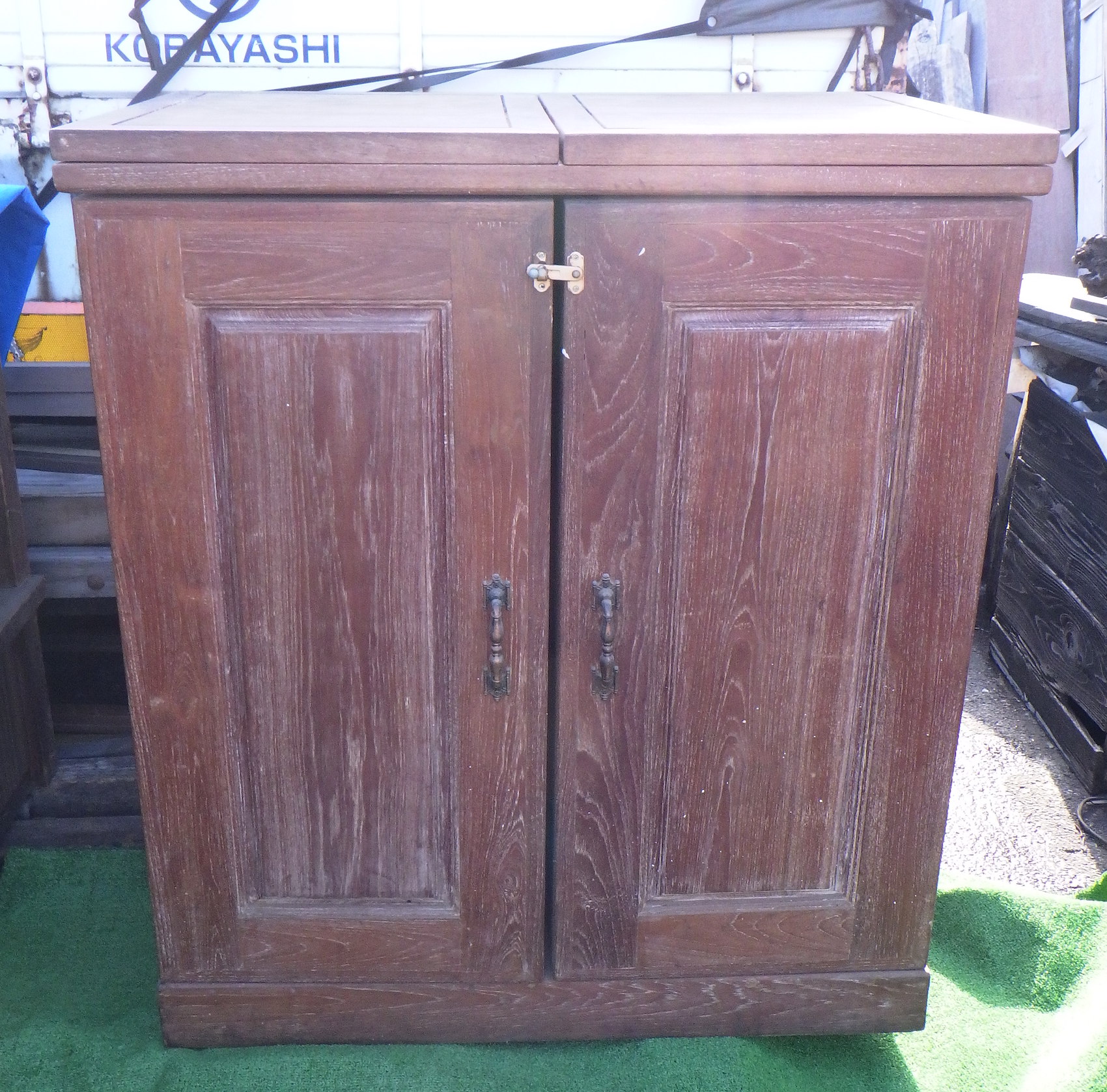 一見、戸棚のようですが、重厚な扉を開けると何本もワインをしまえる収納庫になっています。材質はおそらくチーク材と思われます。ただしまい込むのではなく、見せる収納のデザインになっているところがニクいです。天板は左右にひらきますのでちょっとしたテーブルのように使うこともできると思います。(開くと1825mm)素材にしても、デザインにしてもちょっと珍しいお品と言えそうです。