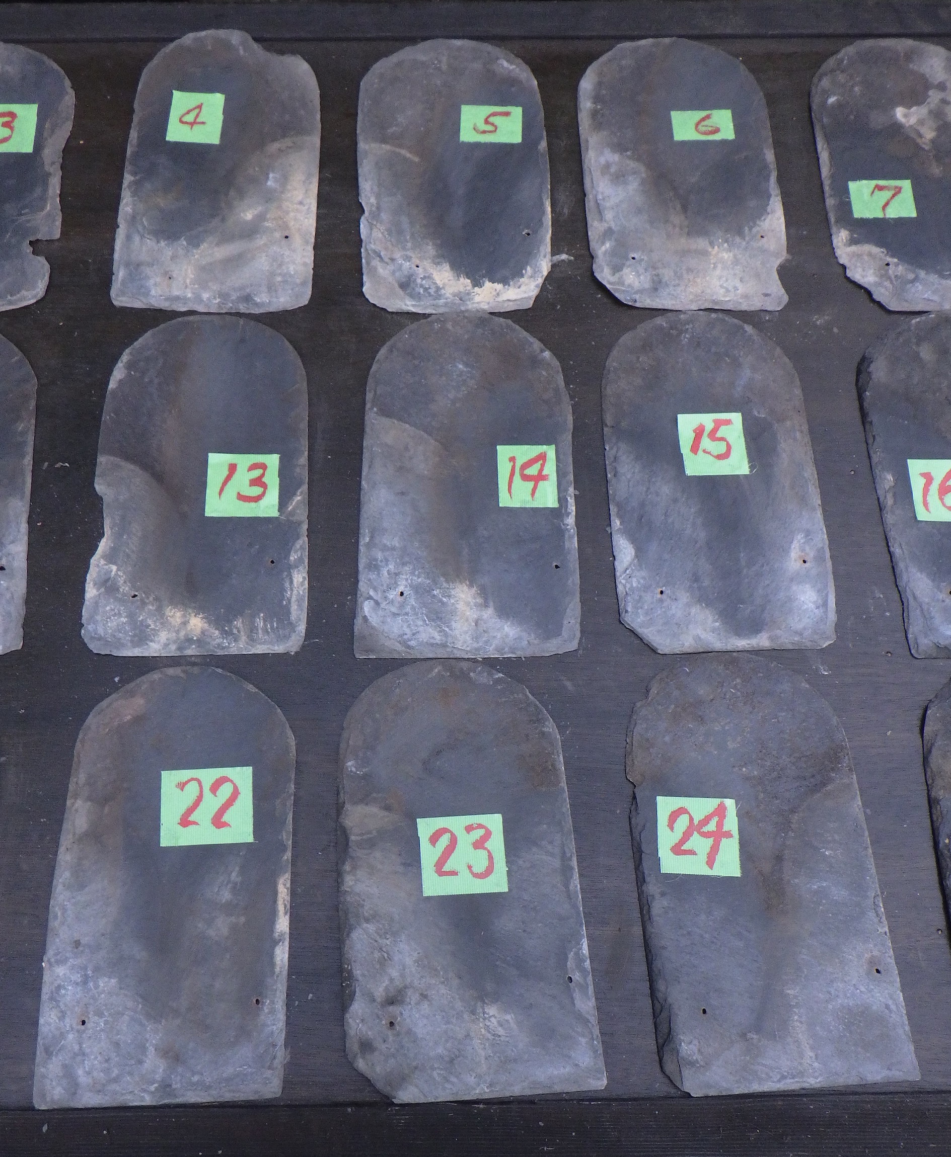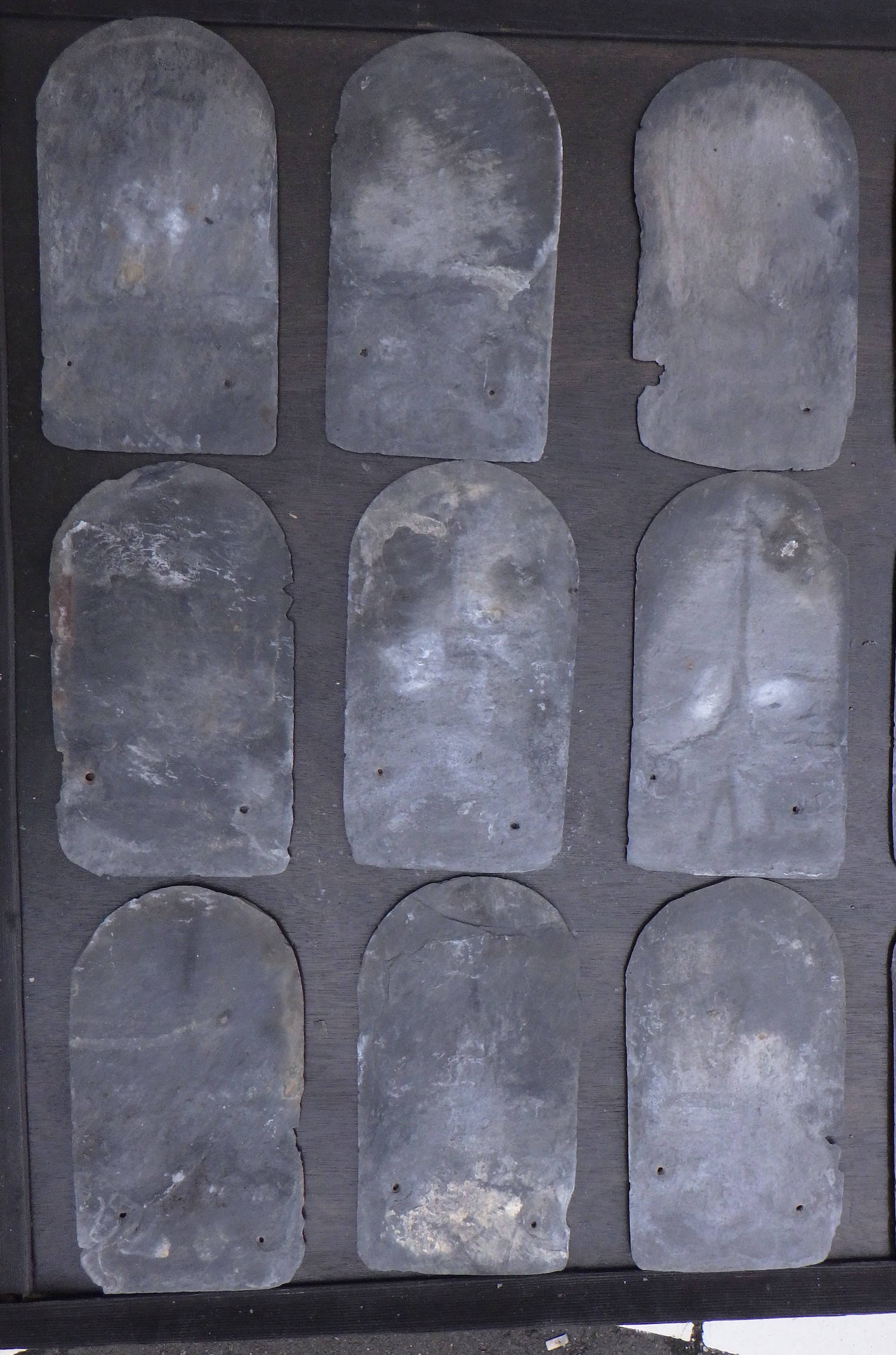 スレートの屋根です。重ねた形にあわせて屋根の跡が残っており、大変面白い素材です。在庫一杯ありますので、お問い合わせください。