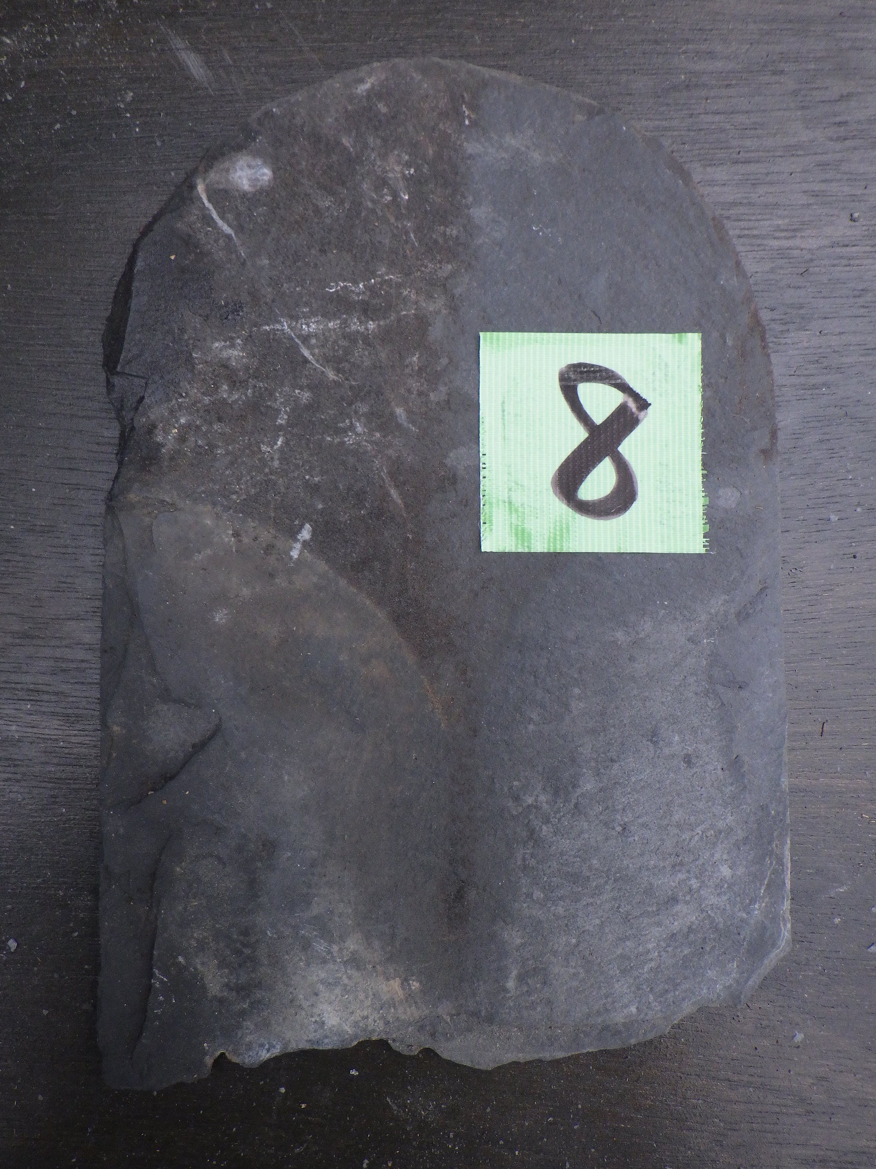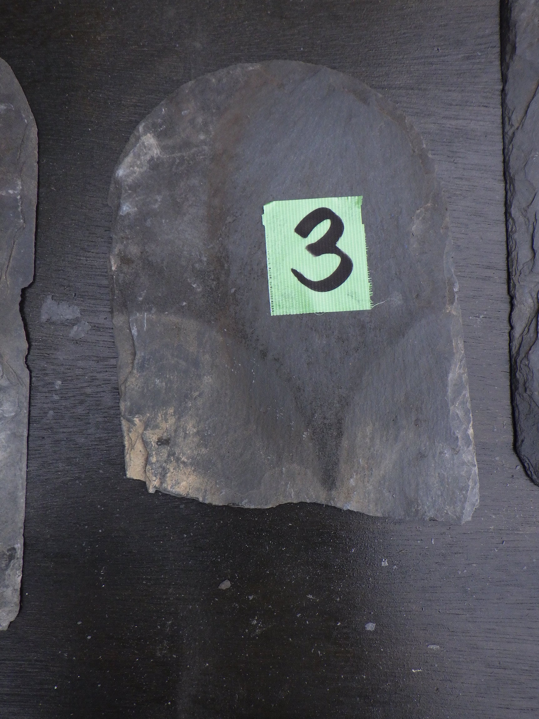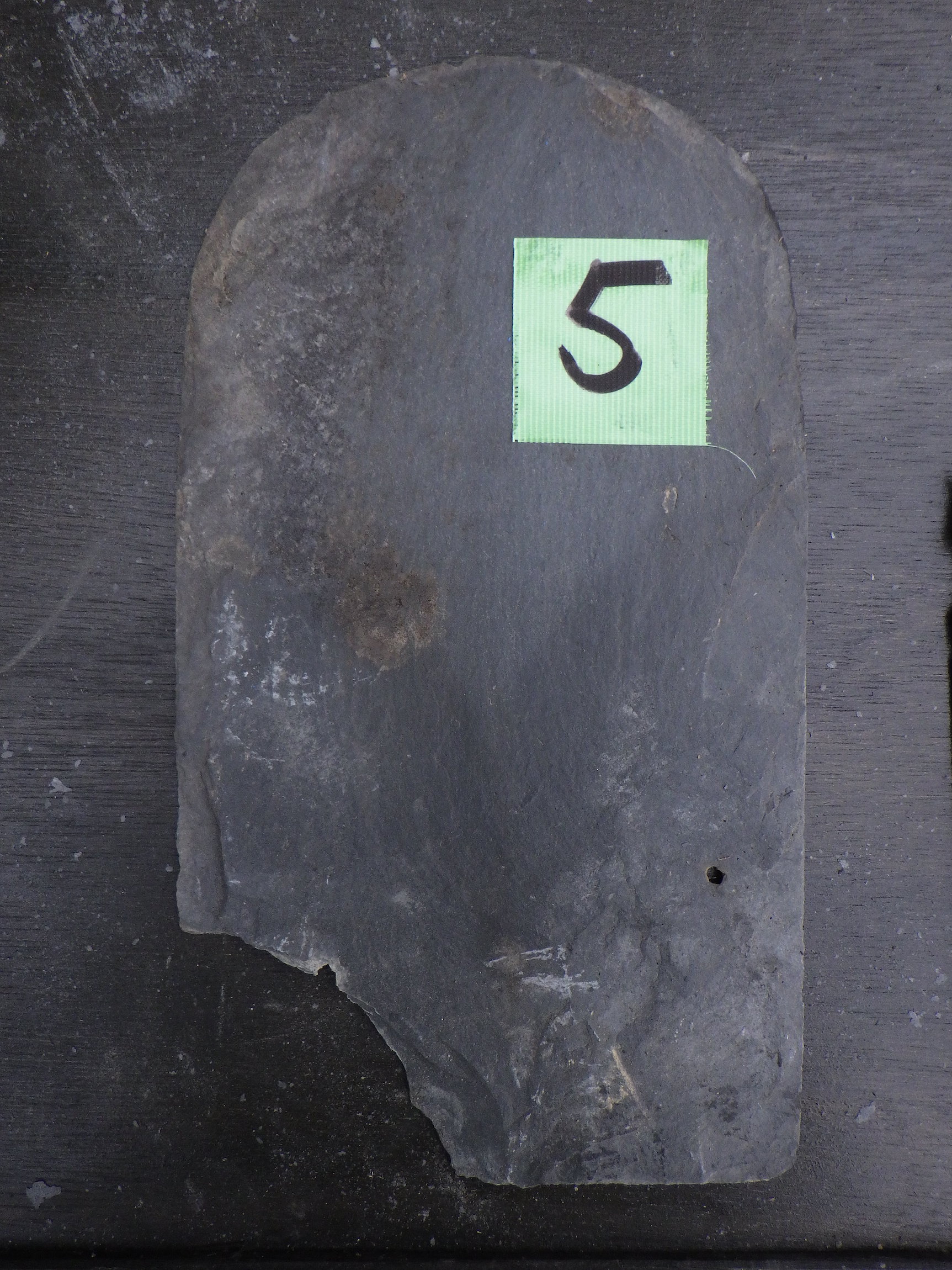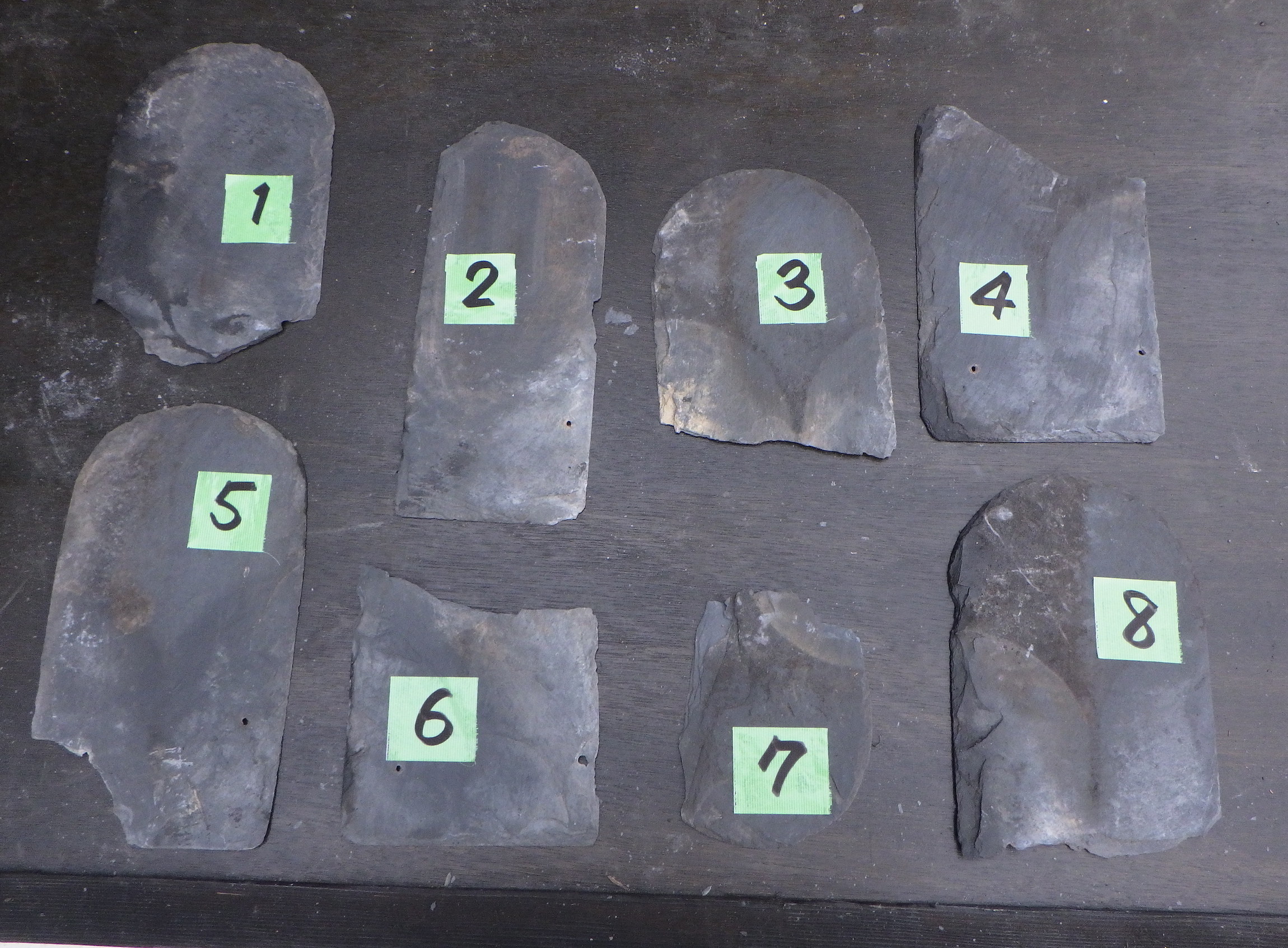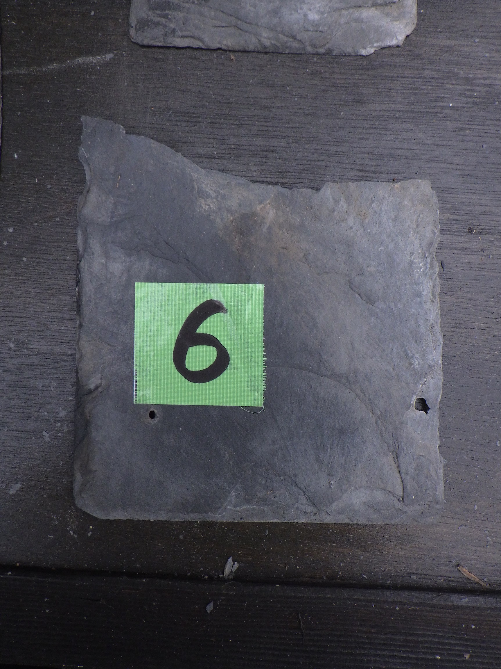 スレートの屋根のかけらです。重ねた形にあわせて屋根の跡が残っており、大変面白い素材です。欠ける前の元々の大きさがおよそ270×150×3です。かけらなので、個々それ以下の大きさになっています。