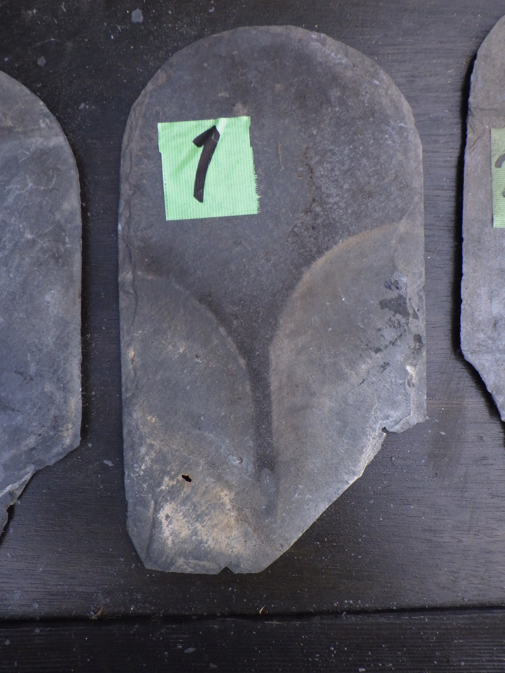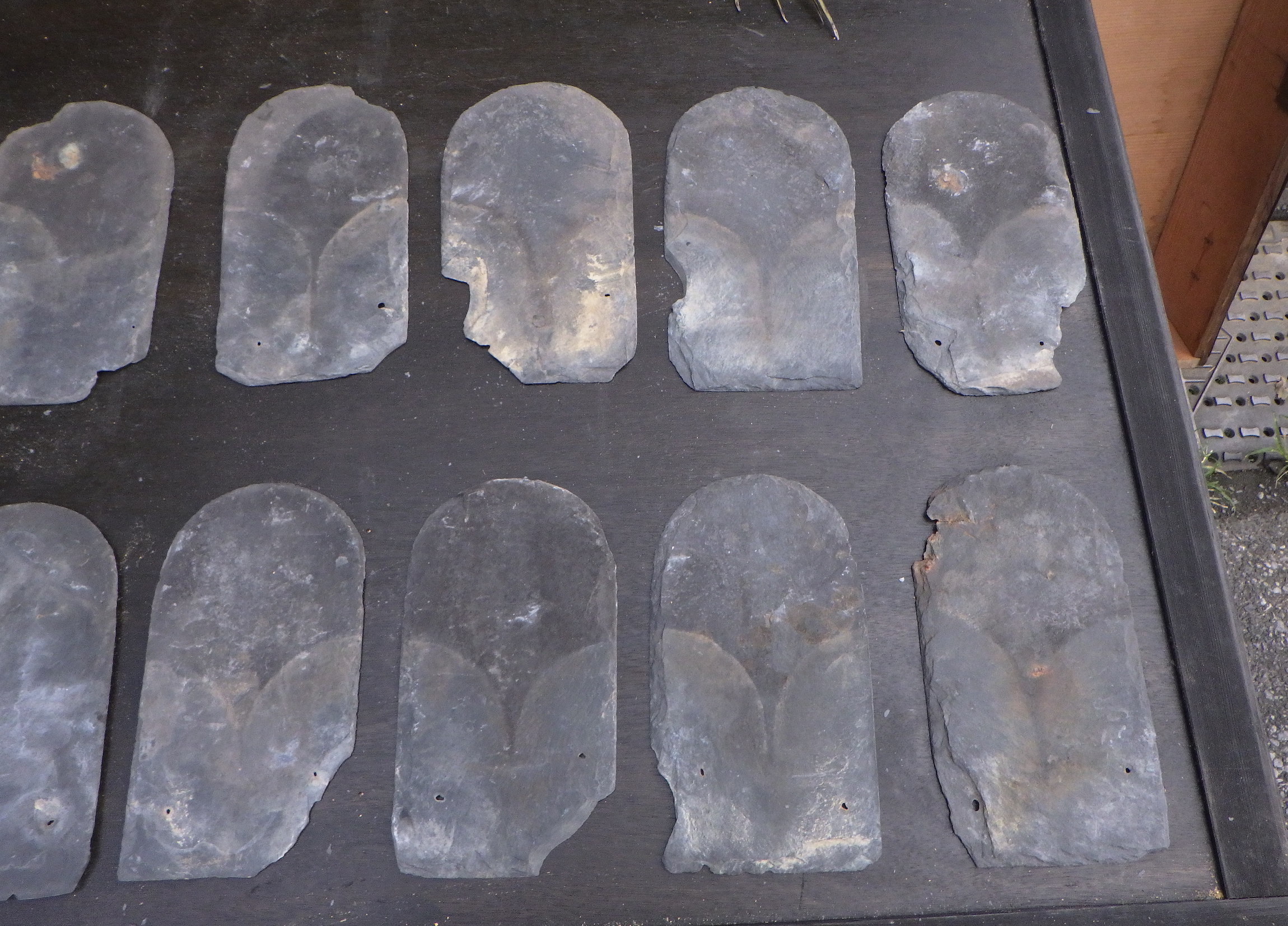 スレートの屋根です。重ねた形にあわせて屋根の跡が残っており、大変面白い素材です。