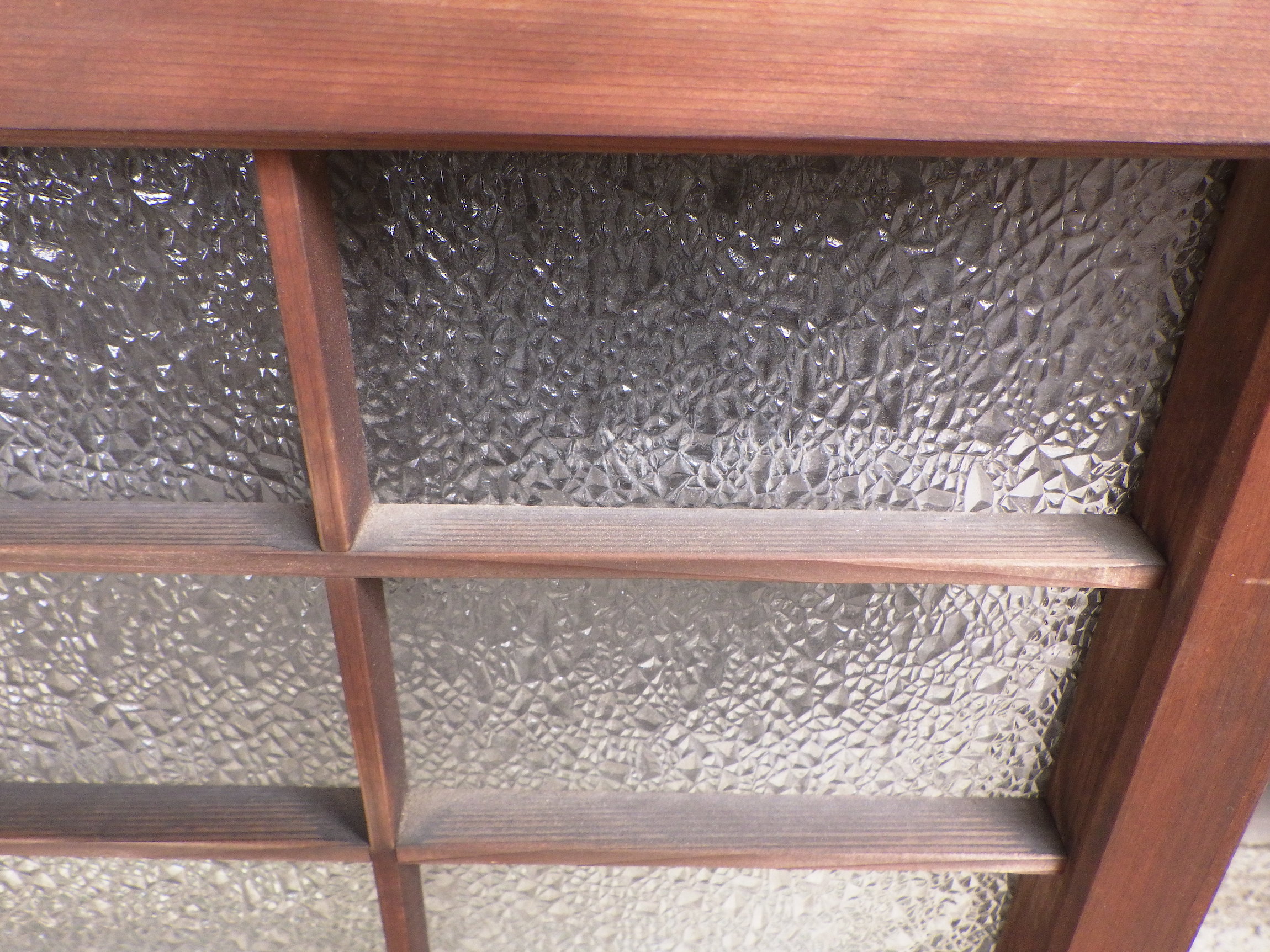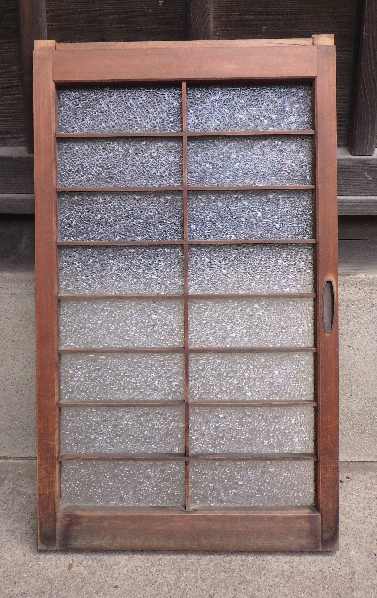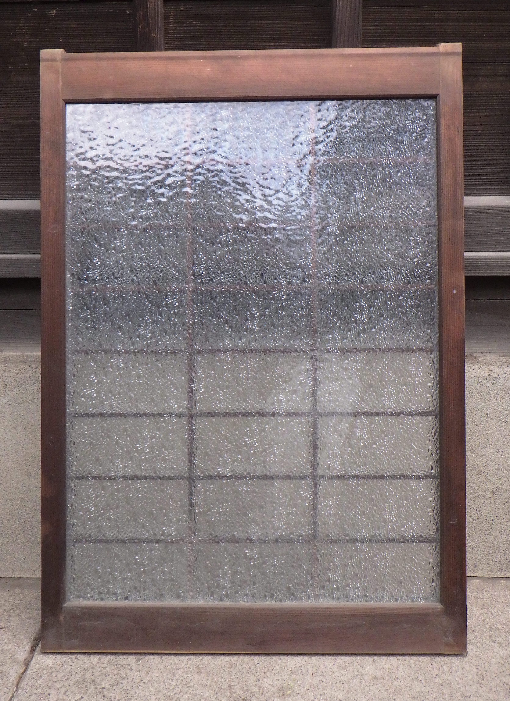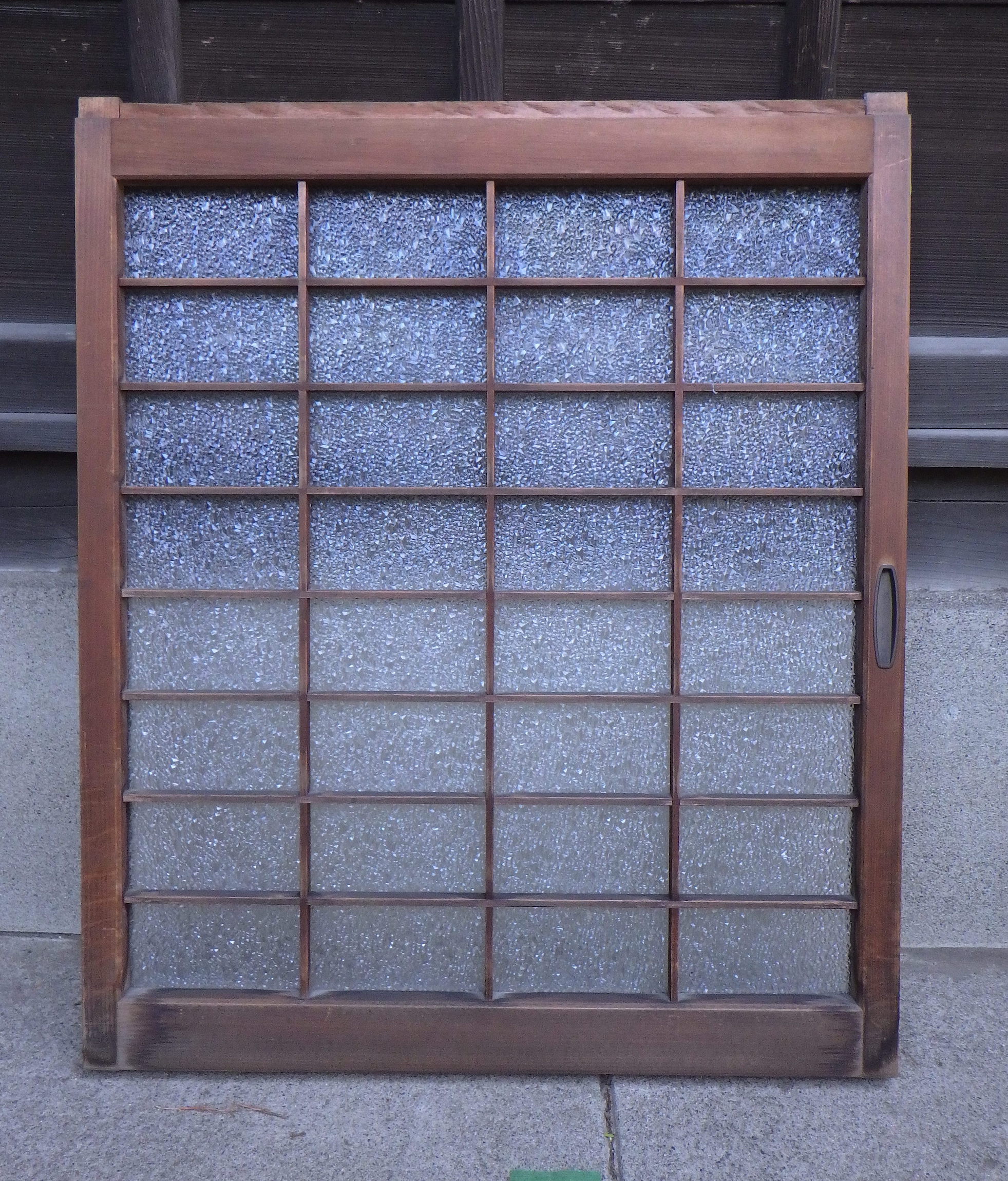 大田区の民家で使われていたものです。ダイヤガラスが使われています。高さ575mmと厚み28mmは全て同じですが、幅のサイズは大中小とございます。大492mm、中410mm、小345mmで在庫がそれぞれ2点ずつございます。