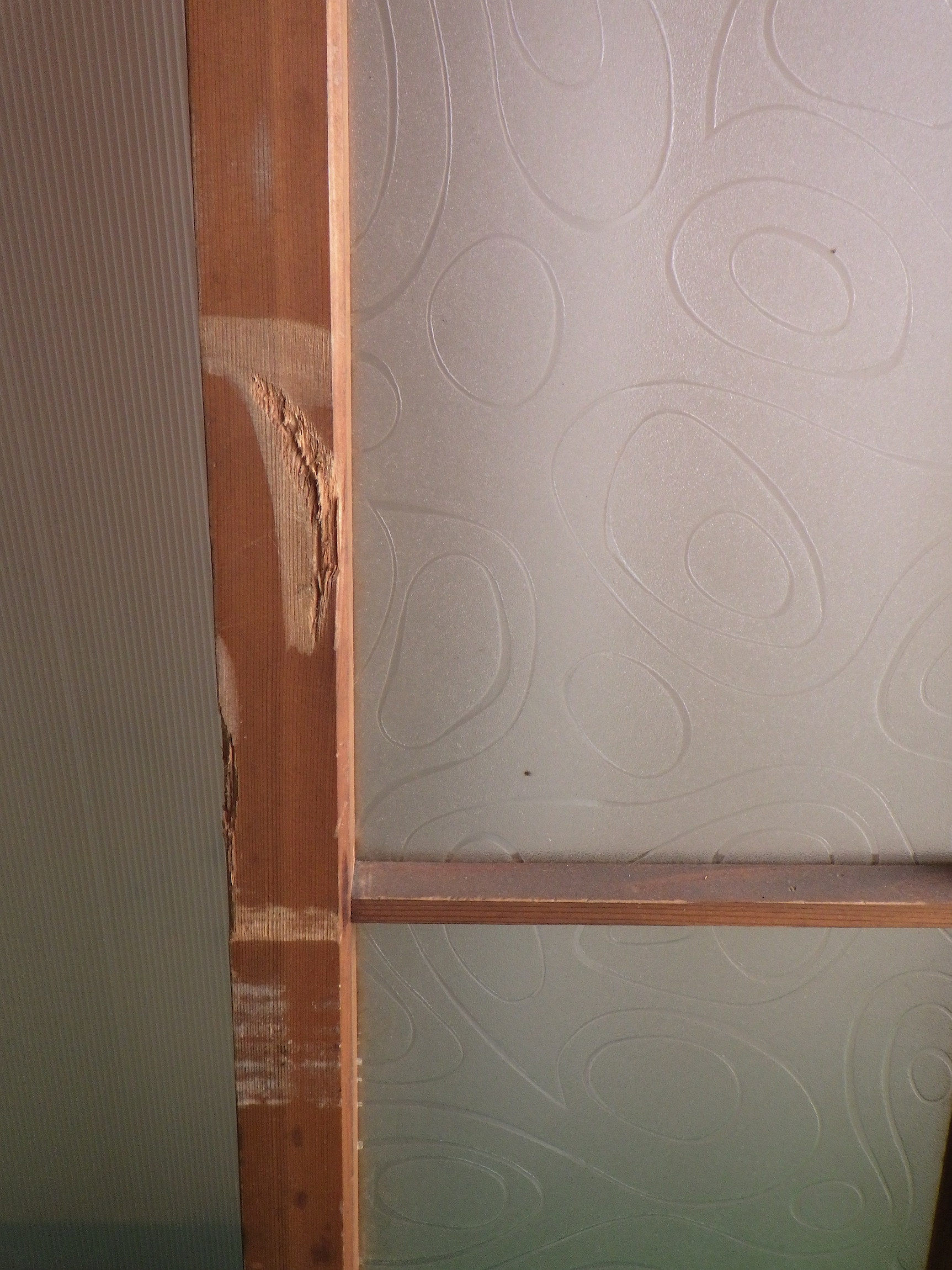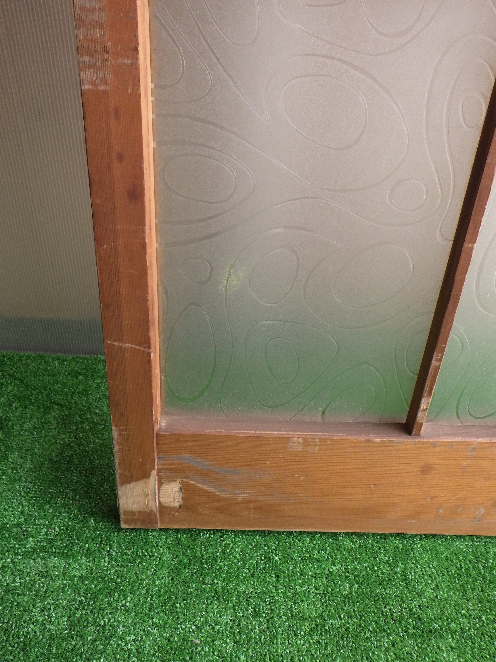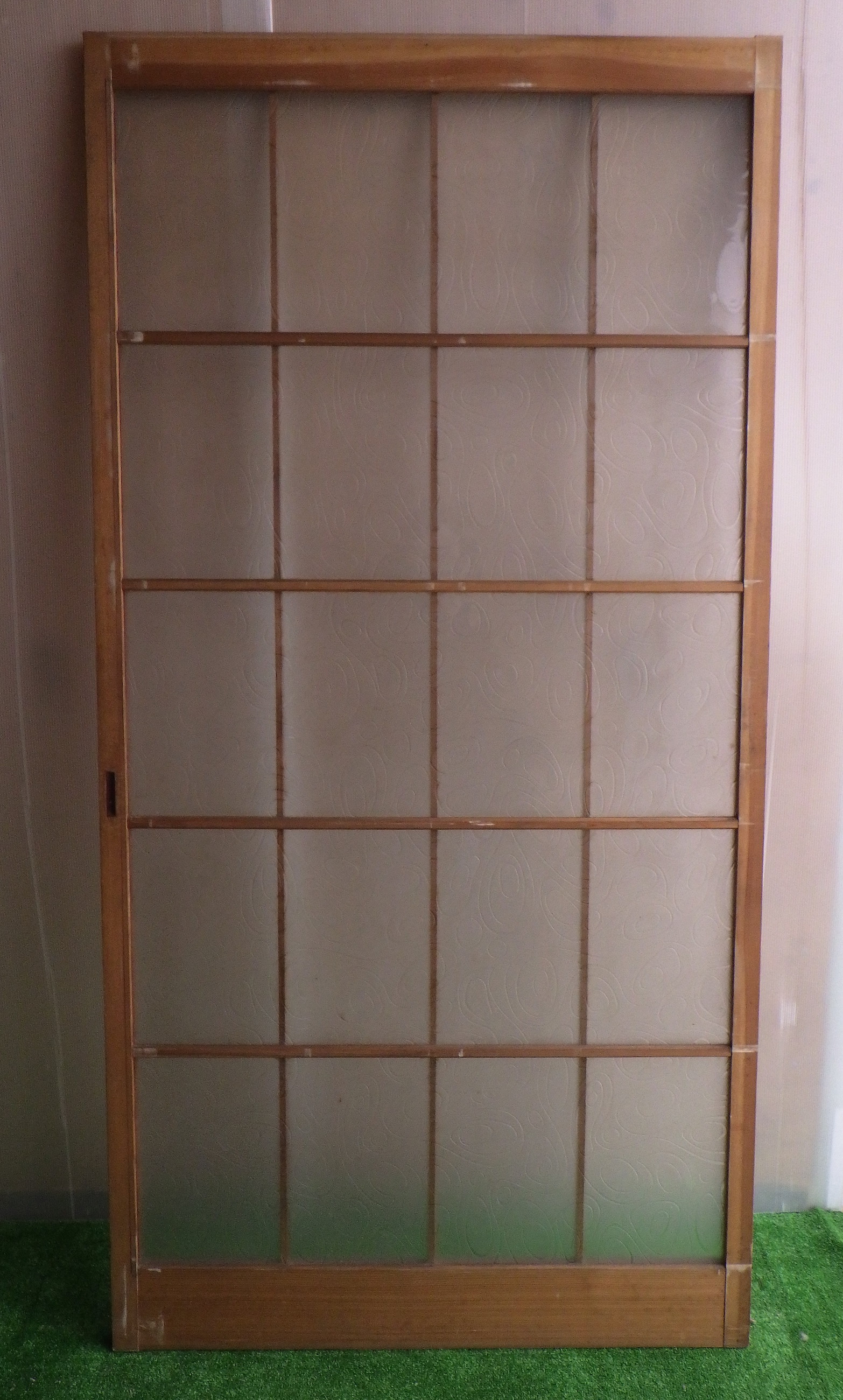 わけあり品。枠等にキズがあるため。川崎の民家で使われていたものです。障子戸のような軽やかさのある格子デザイン。ガラスには曲線がゆるやかに流れているような模様がついています。