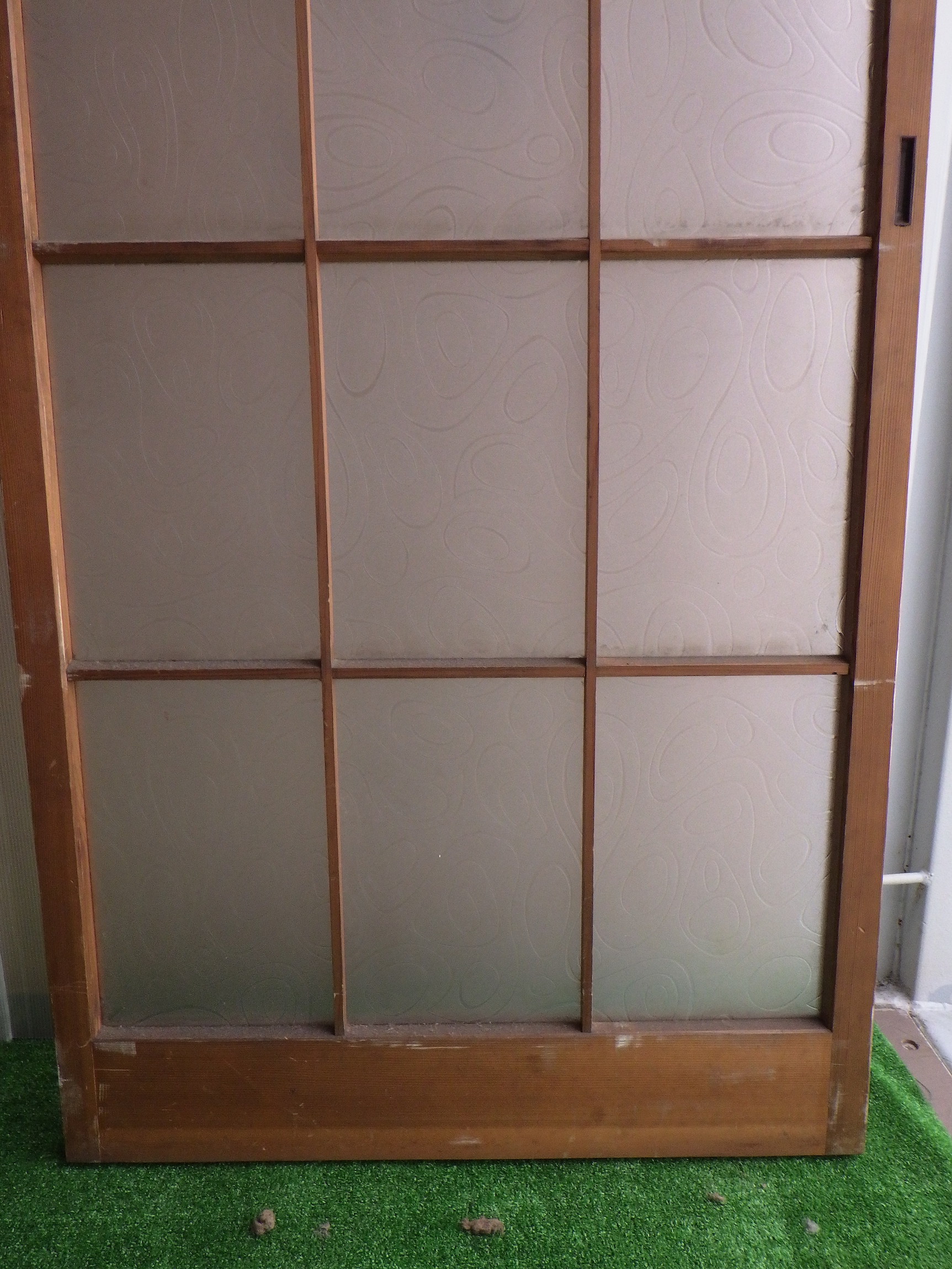 川崎の民家で使われていたものです。障子戸のような軽やかさのある格子デザイン。ガラスには曲線がゆるやかに流れているような模様がついています。
