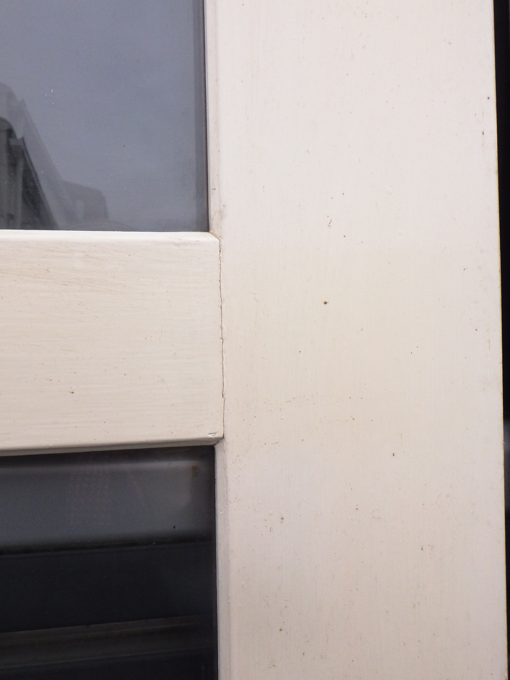 幅が1M以上あり、比較的大きめのガラス戸になります。デザイナーによる意匠で、取っ手のような曲線が中央にあります。白い面は屋外側に使われており、ペンキが塗られています。