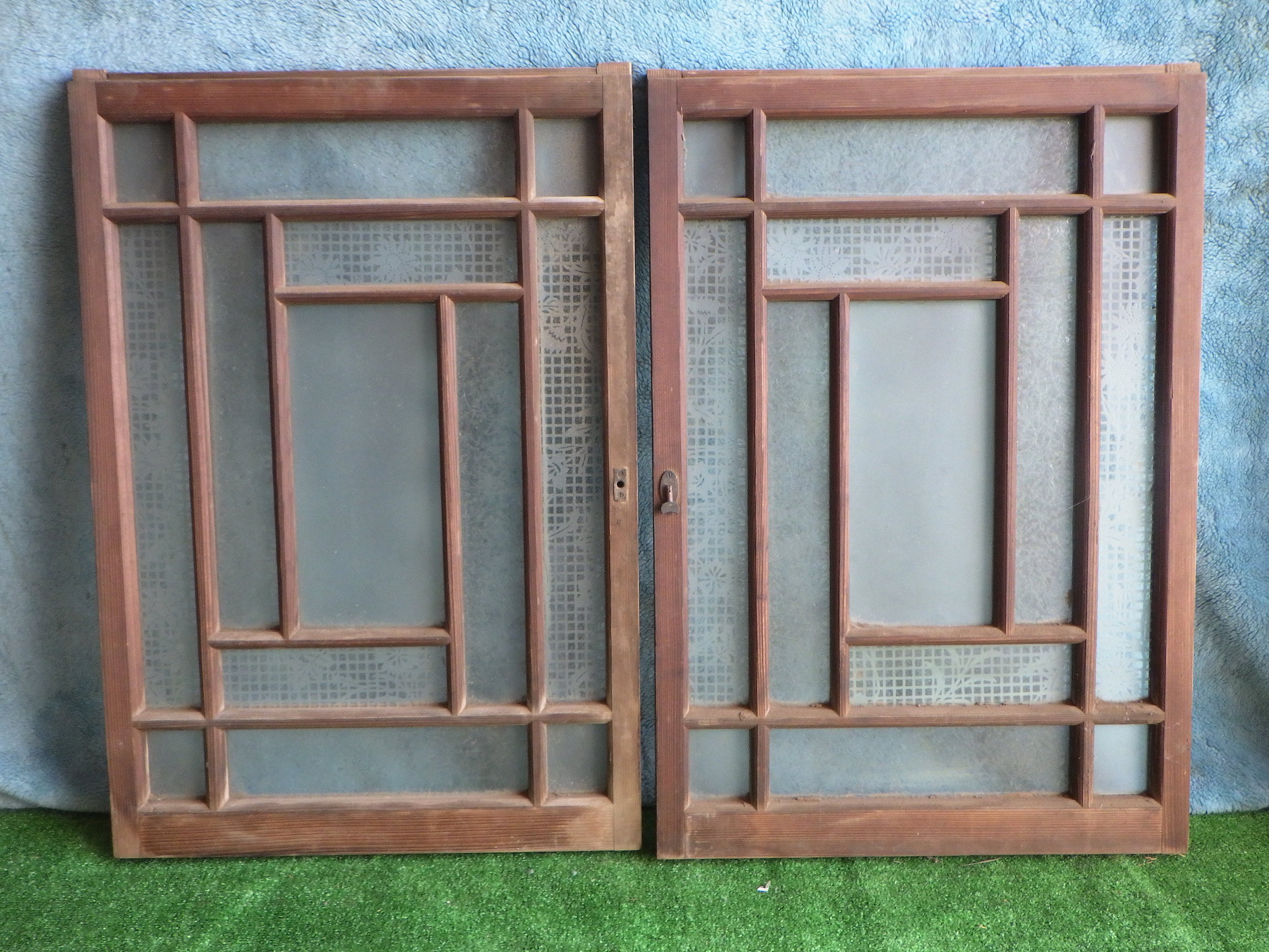 花柄とチェックが重なったレトロな模様のガラス、曇りガラス、草ガラスがそれぞれ4枚ずつ使われています。懐かしさ漂う窓です。